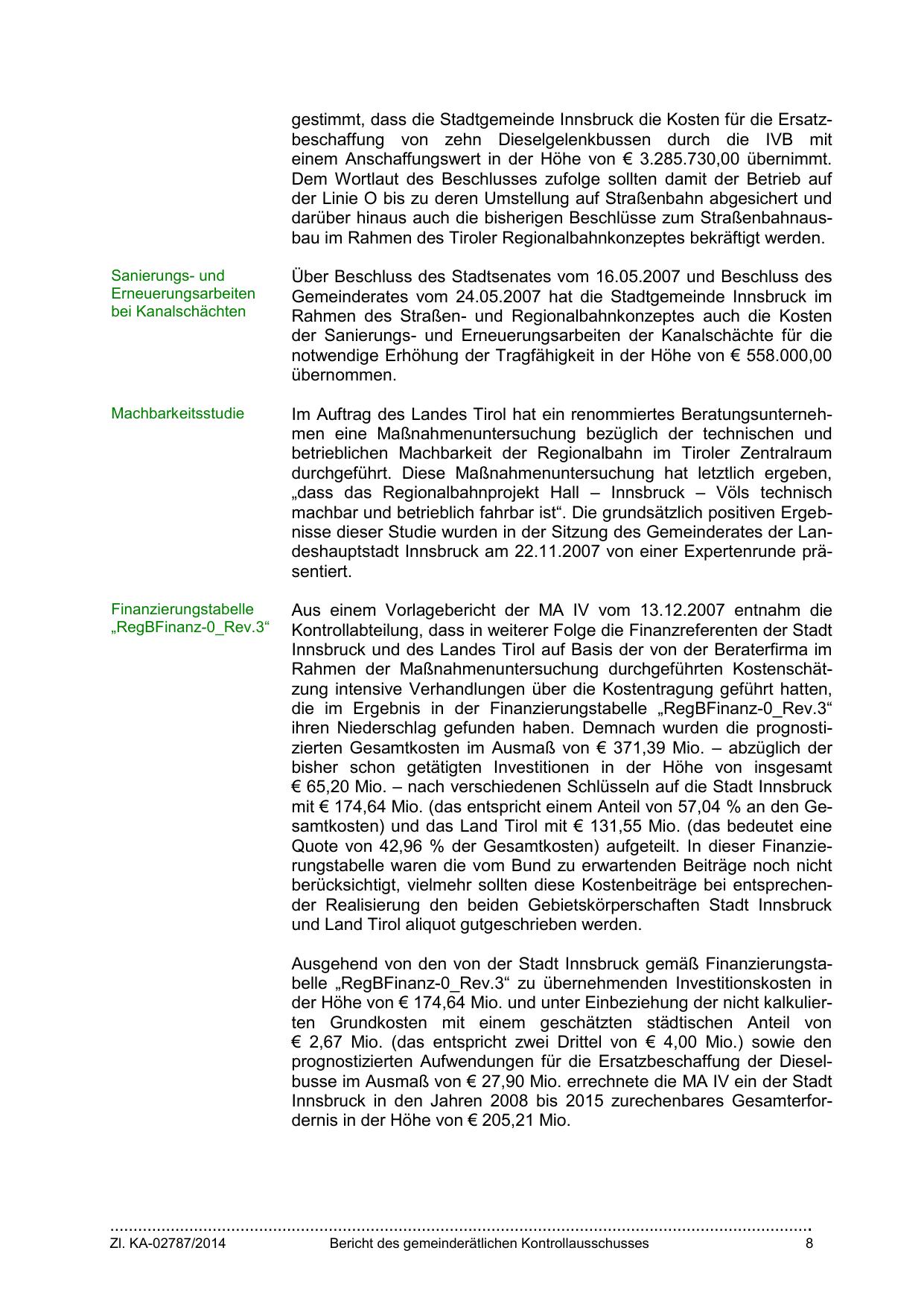 Innsbruck in den Jahren 2008 bis 2015 zurechenbares Gesamterfordernis in der Höhe von € 205,21 Mio.