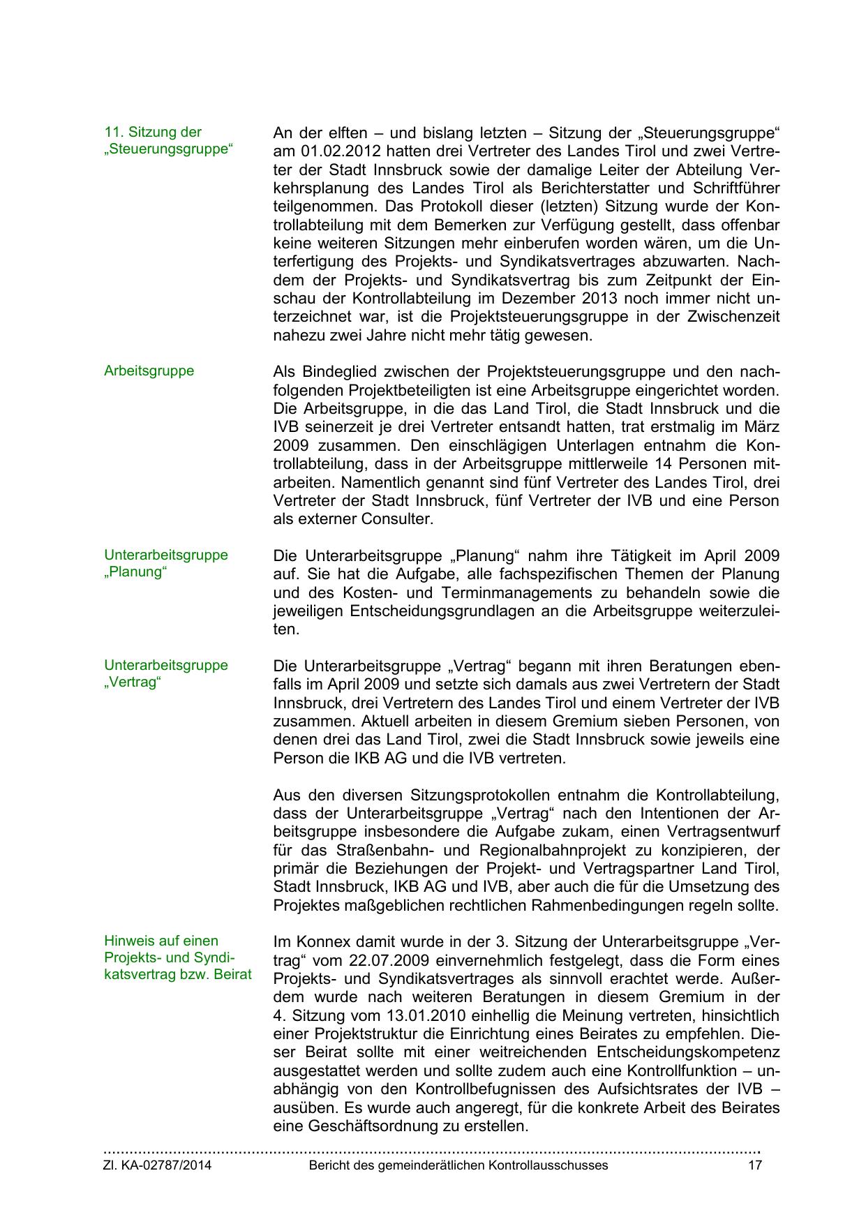 2009 zusammen. Den einschlägigen Unterlagen entnahm die Kontrollabteilung, dass in der Arbeitsgruppe mittlerweile 14 Personen mitarbeiten. Namentlich genannt sind fünf Vertreter des Landes Tirol, drei