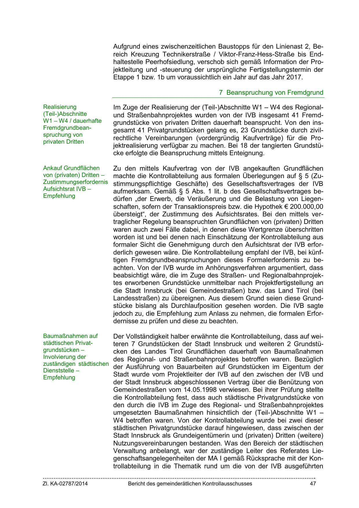 Im Zuge der Realisierung der (Teil-)Abschnitte W1 – W4 des Regionalund Straßenbahnprojektes wurden von der IVB insgesamt 41 Fremdgrundstücke von privaten Dritten dauerhaft beansprucht. Von den insgesamt 41 Privatgrundstücken gelang es, 23 Grundstücke durch zivilrechtliche Vereinbarungen (vordergründig Kaufverträge) für die Projektrealisierung verfügbar zu machen. Bei 18 der tangierten Grundstücke erfolgte die Beanspruchung mittels Enteignung.