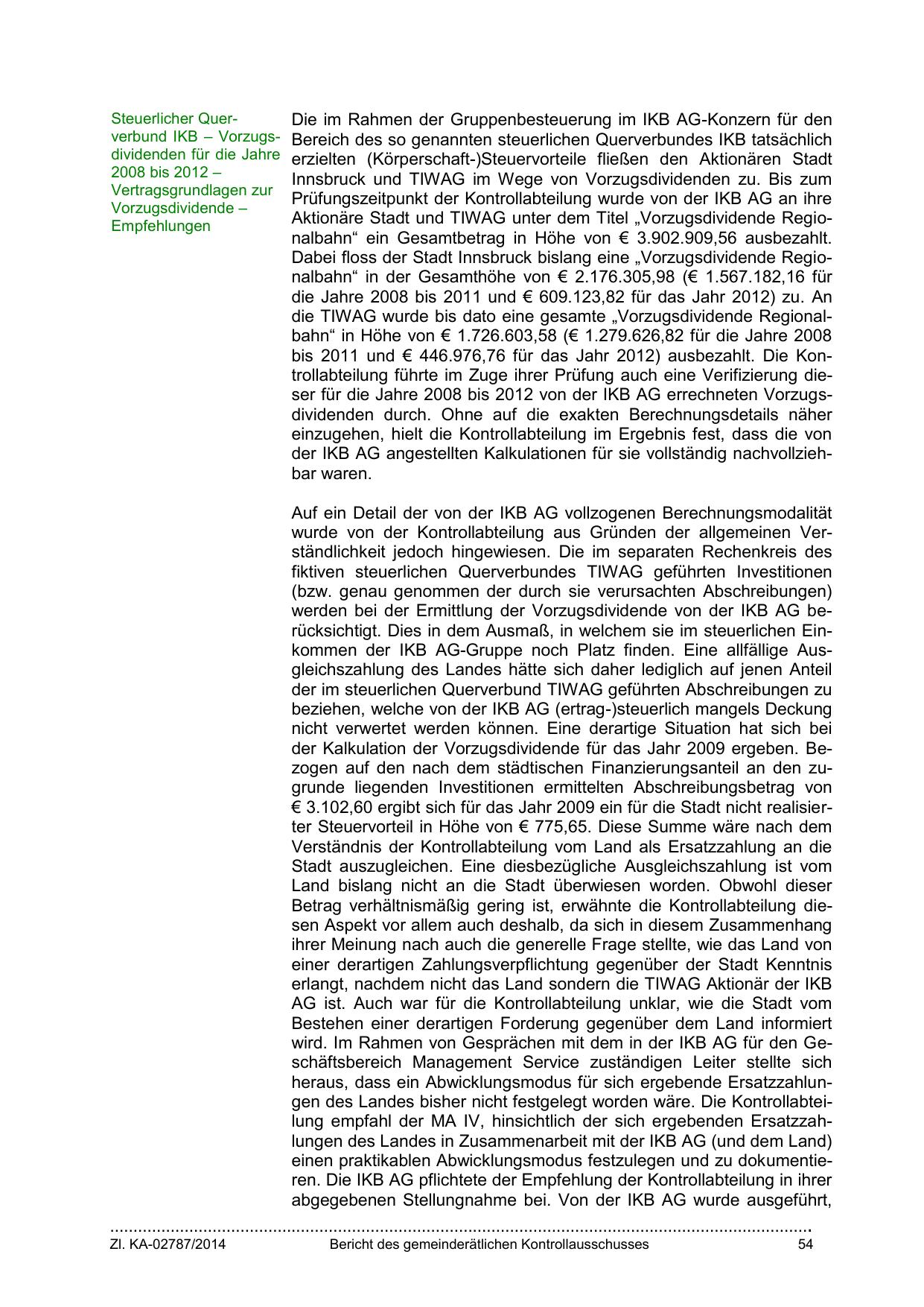 bis 2011 und € 446.976,76 für das Jahr 2012) ausbezahlt. Die Kontrollabteilung führte im Zuge ihrer Prüfung auch eine Verifizierung dieser für die Jahre 2008 bis 2012 von der IKB AG errechneten Vorzugsdividenden durch. Ohne auf die exakten Berechnungsdetails näher