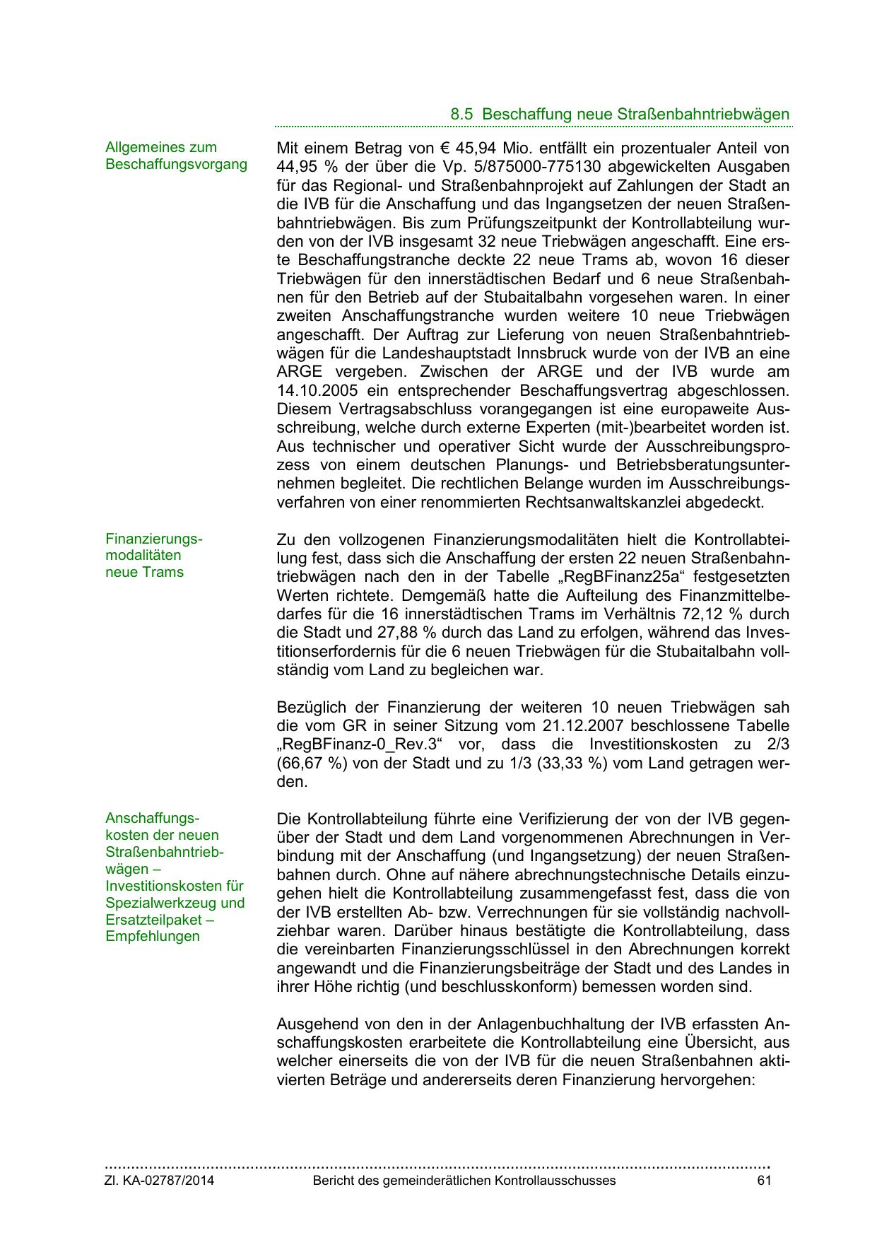 Die Kontrollabteilung führte eine Verifizierung der von der IVB gegenüber der Stadt und dem Land vorgenommenen Abrechnungen in Verbindung mit der Anschaffung (und Ingangsetzung) der neuen Straßenbahnen durch. Ohne auf nähere abrechnungstechnische Details einzugehen hielt die Kontrollabteilung zusammengefasst fest, dass die von