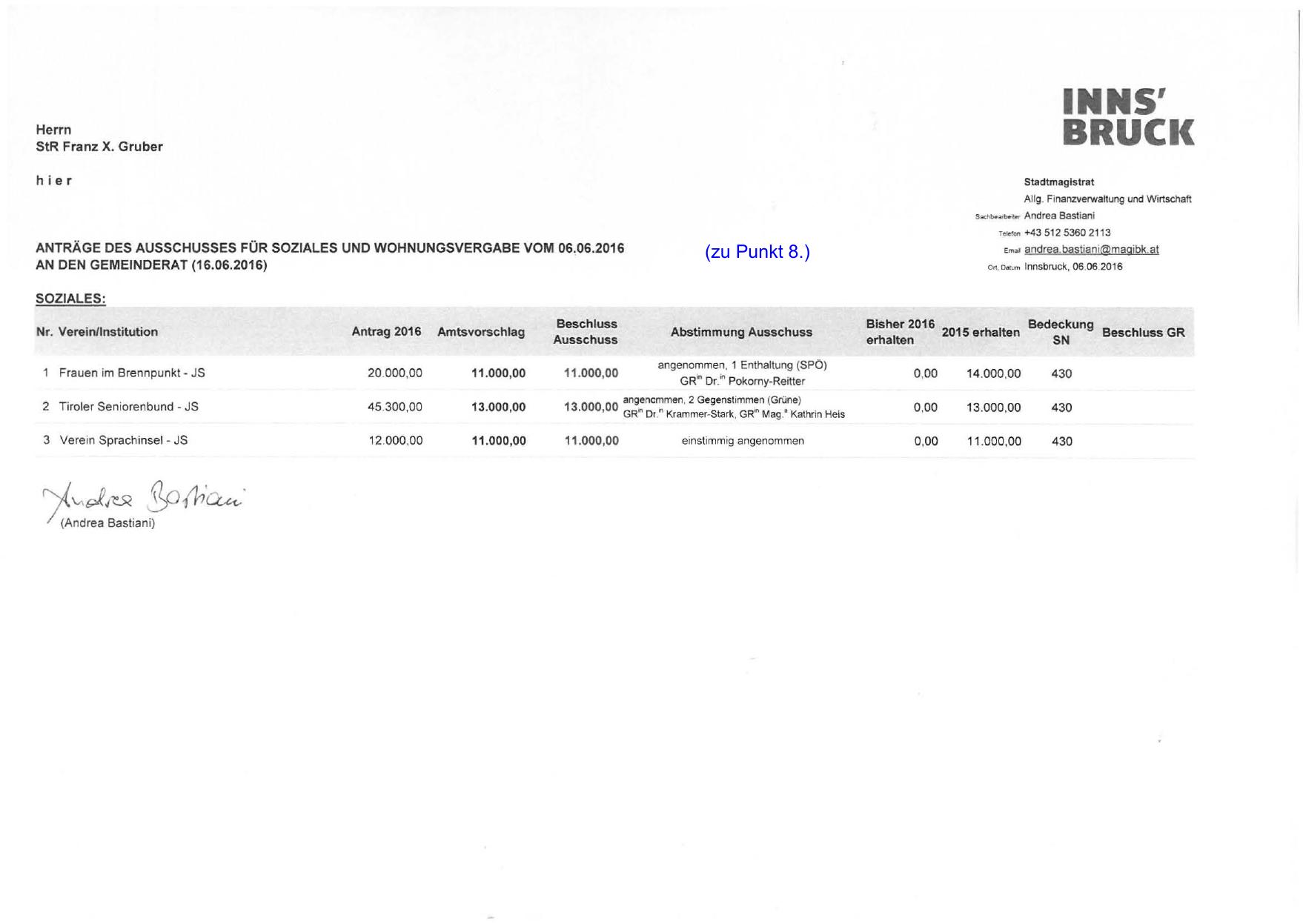 ANTRÄGE DES AUSSCHUSSES FÜR SOZIALES UND WOHNUNGSVERGABE VOM 06.06.2016