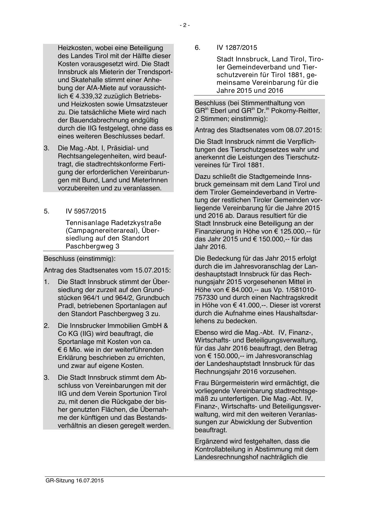 Innsbruck als Mieterin der Trendsportund Skatehalle stimmt einer Anhebung der AfA-Miete auf voraussichtlich € 4.339,32 zuzüglich Betriebsund Heizkosten sowie Umsatzsteuer