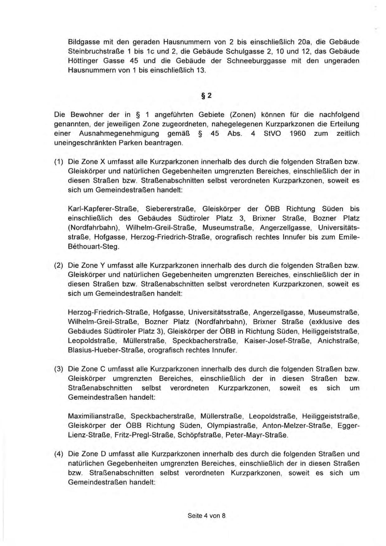 (4) Die Zone 0 umfasst alle Kurzparkzonen innerhalb des durch die folgenden Straßen und