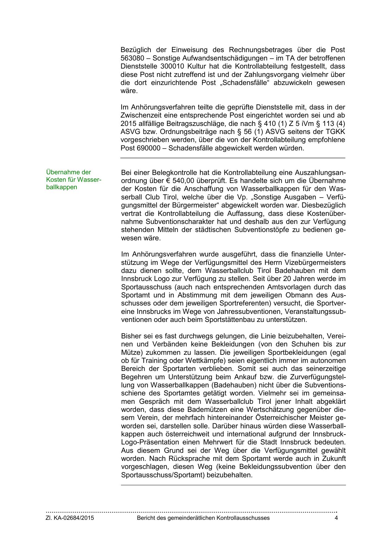 der Kosten für die Anschaffung von Wasserballkappen für den Wasserball Club Tirol, welche über die Vp. „Sonstige Ausgaben – Verfügungsmittel der Bürgermeister“ abgewickelt worden war. Diesbezüglich
