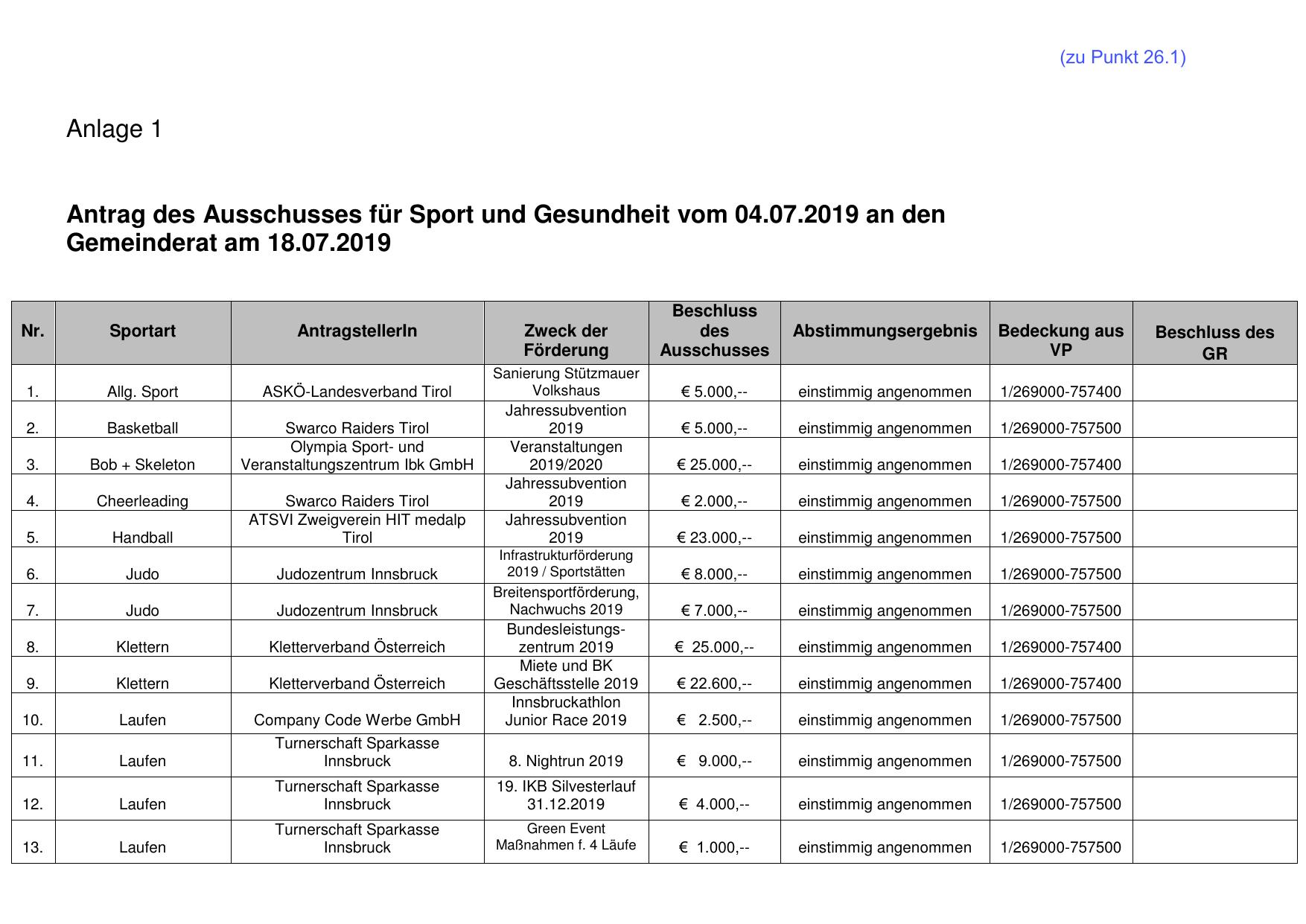 Antrag des Ausschusses für Sport und Gesundheit vom 04.07.2019 an den