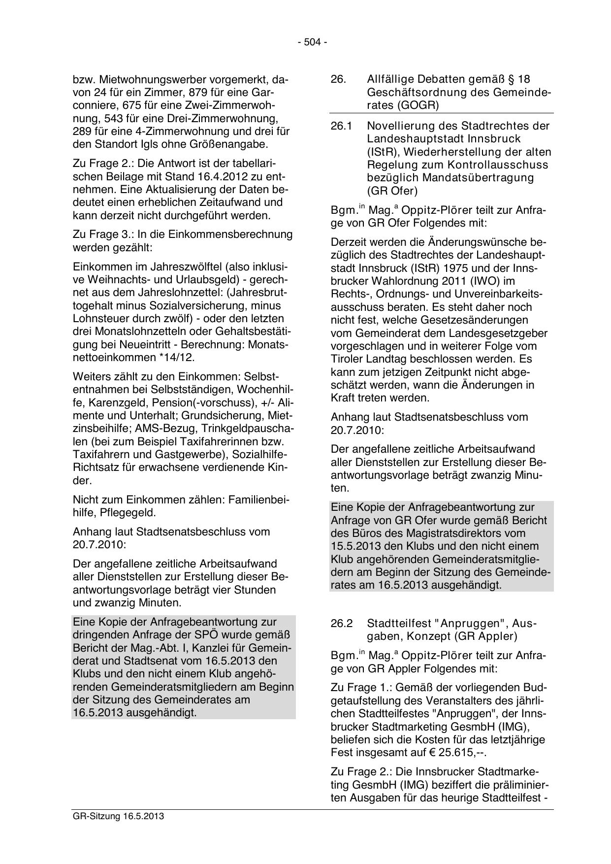 Bgm.in Mag.a Oppitz-Plörer teilt zur Anfrage von GR Ofer Folgendes mit: