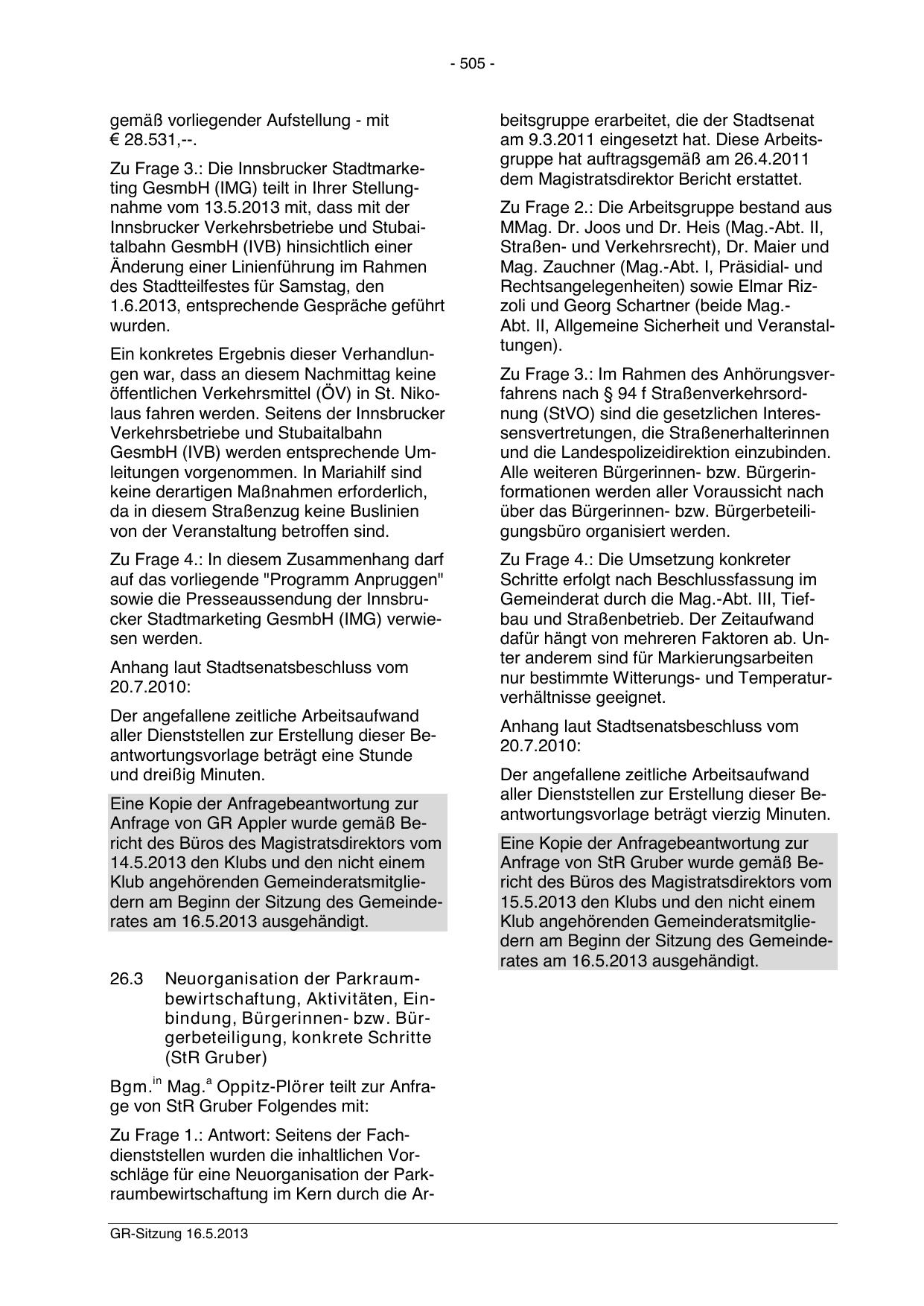 Zu Frage 1.: Antwort: Seitens der Fachdienststellen wurden die inhaltlichen Vorschläge für eine Neuorganisation der Parkraumbewirtschaftung im Kern durch die ArGR-Sitzung 16.5.2013
