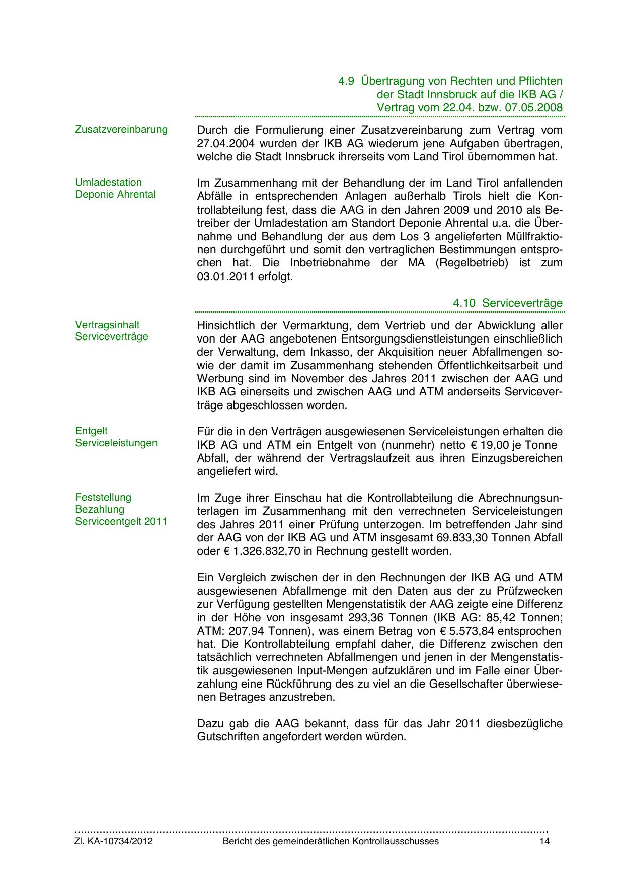 Abfälle in entsprechenden Anlagen außerhalb Tirols hielt die Kontrollabteilung fest, dass die AAG in den Jahren 2009 und 2010 als Betreiber der Umladestation am Standort Deponie Ahrental u.a. die Übernahme und Behandlung der aus dem Los 3 angelieferten Müllfraktionen durchgeführt und somit den vertraglichen Bestimmungen entsprochen hat. Die Inbetriebnahme der MA (Regelbetrieb) ist zum