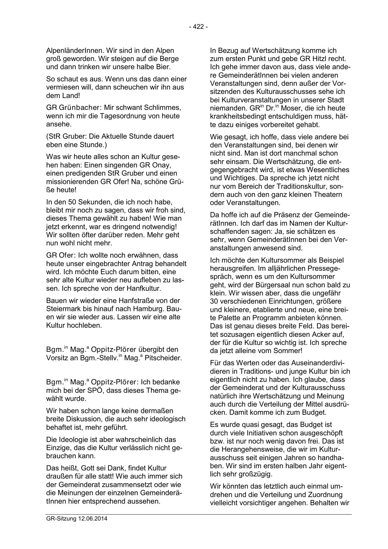 Da hoffe ich auf die Präsenz der GemeinderätInnen. Ich darf das im Namen der Kulturschaffenden sagen: Ja, sie schätzen es