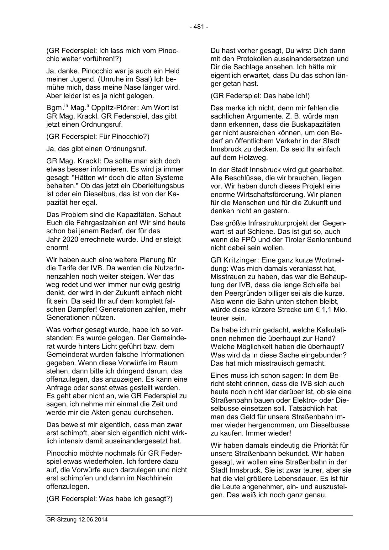 Pinocchio möchte nochmals für GR Federspiel etwas wiederholen. Ich fordere dazu