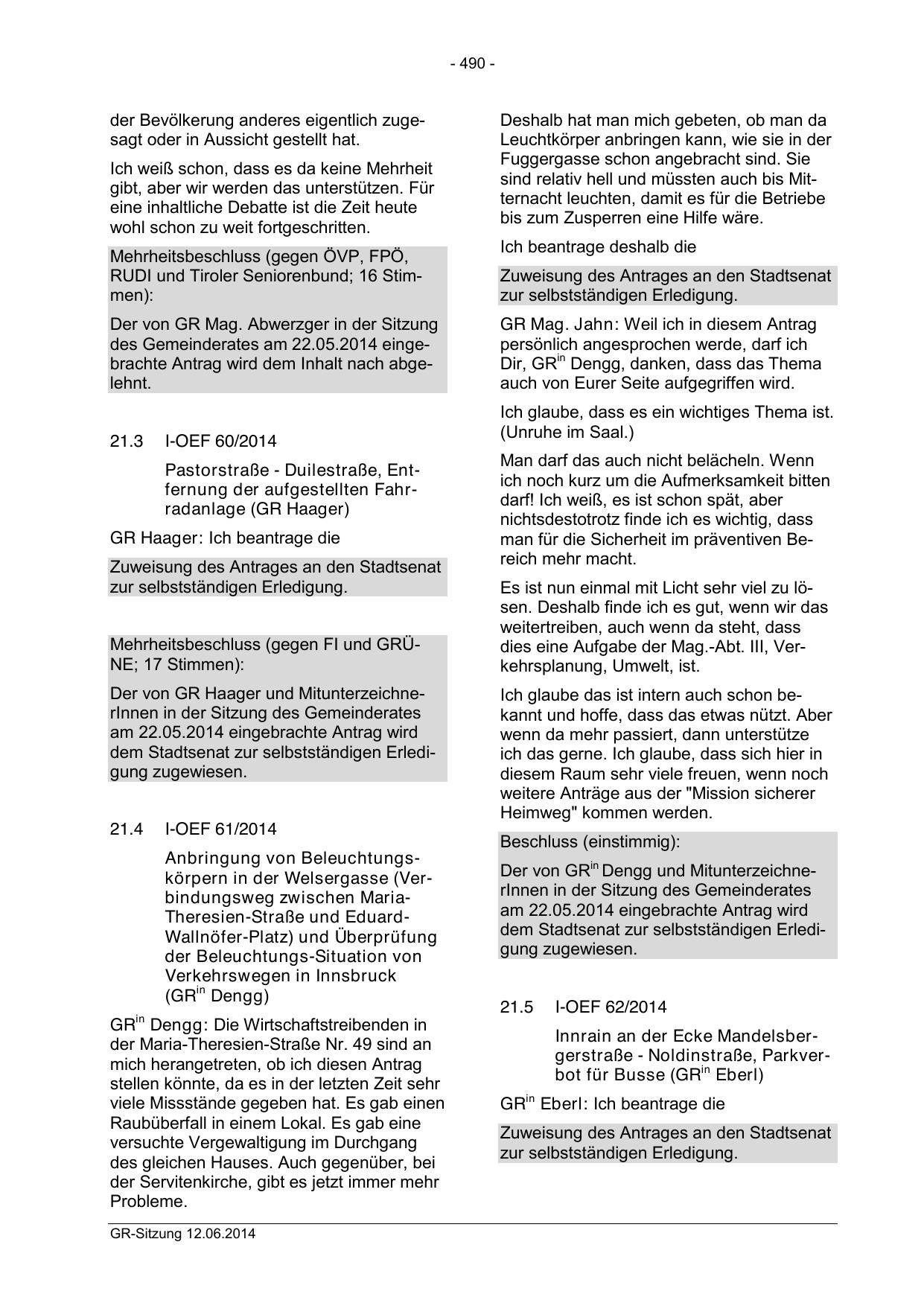 Mehrheitsbeschluss (gegen FI und GRÜNE; 17 Stimmen):