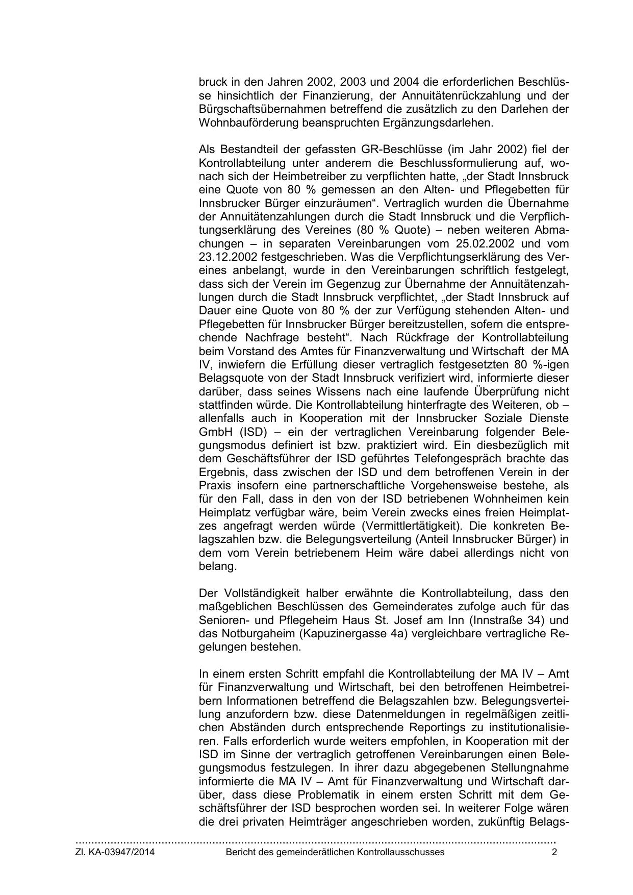 Kontrollabteilung unter anderem die Beschlussformulierung auf, wonach sich der Heimbetreiber zu verpflichten hatte, „der Stadt Innsbruck