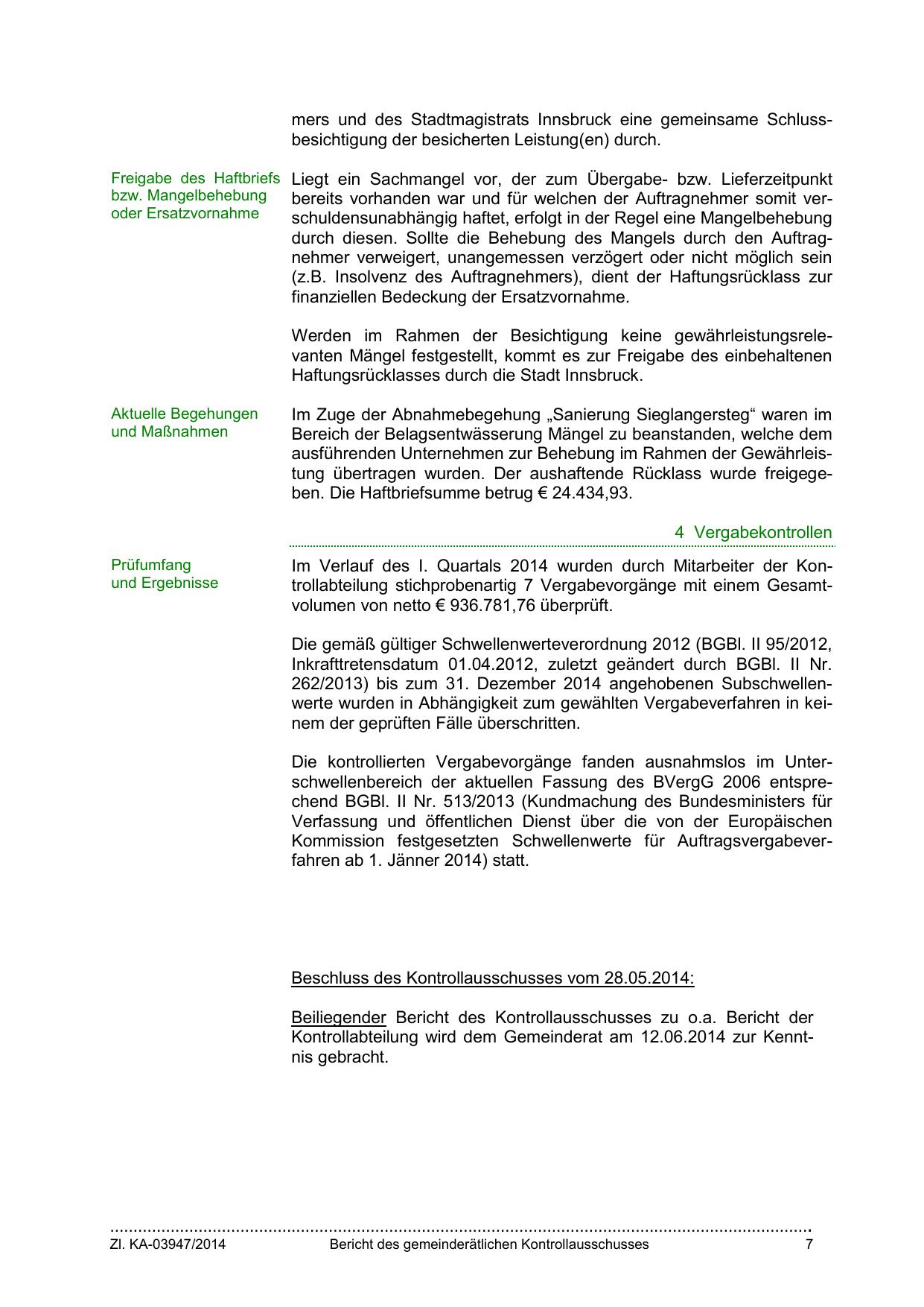 Im Verlauf des I. Quartals 2014 wurden durch Mitarbeiter der Kontrollabteilung stichprobenartig 7 Vergabevorgänge mit einem Gesamtvolumen von netto € 936.781,76 überprüft.