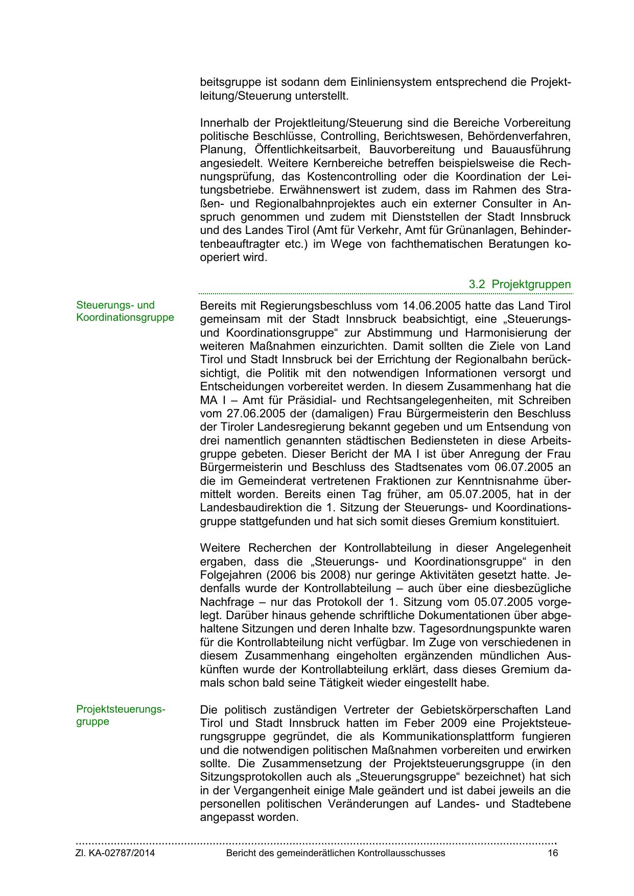 angesiedelt. Weitere Kernbereiche betreffen beispielsweise die Rechnungsprüfung, das Kostencontrolling oder die Koordination der Leitungsbetriebe. Erwähnenswert ist zudem, dass im Rahmen des Straßen- und Regionalbahnprojektes auch ein externer Consulter in Anspruch genommen und zudem mit Dienststellen der Stadt Innsbruck