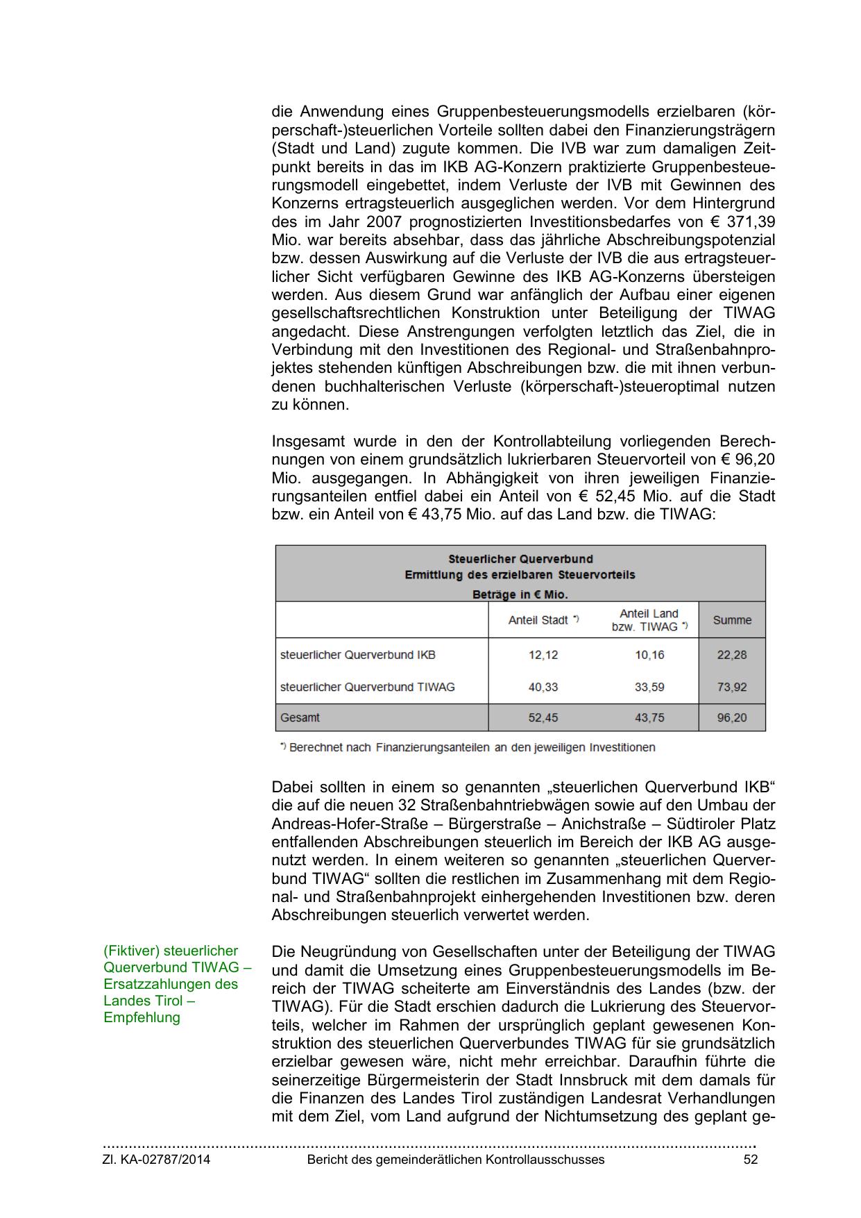 entfallenden Abschreibungen steuerlich im Bereich der IKB AG ausgenutzt werden. In einem weiteren so genannten „steuerlichen Querverbund TIWAG“ sollten die restlichen im Zusammenhang mit dem Regional- und Straßenbahnprojekt einhergehenden Investitionen bzw. deren