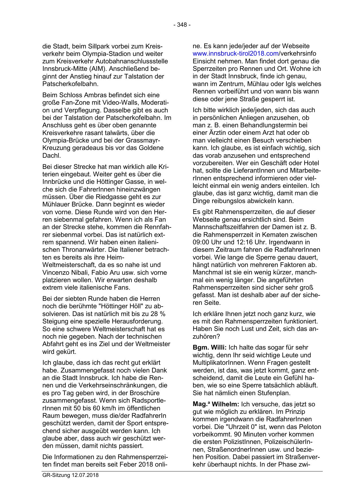 an die Stadt Innsbruck. Ich habe die Rennen und die Verkehrseinschränkungen, die