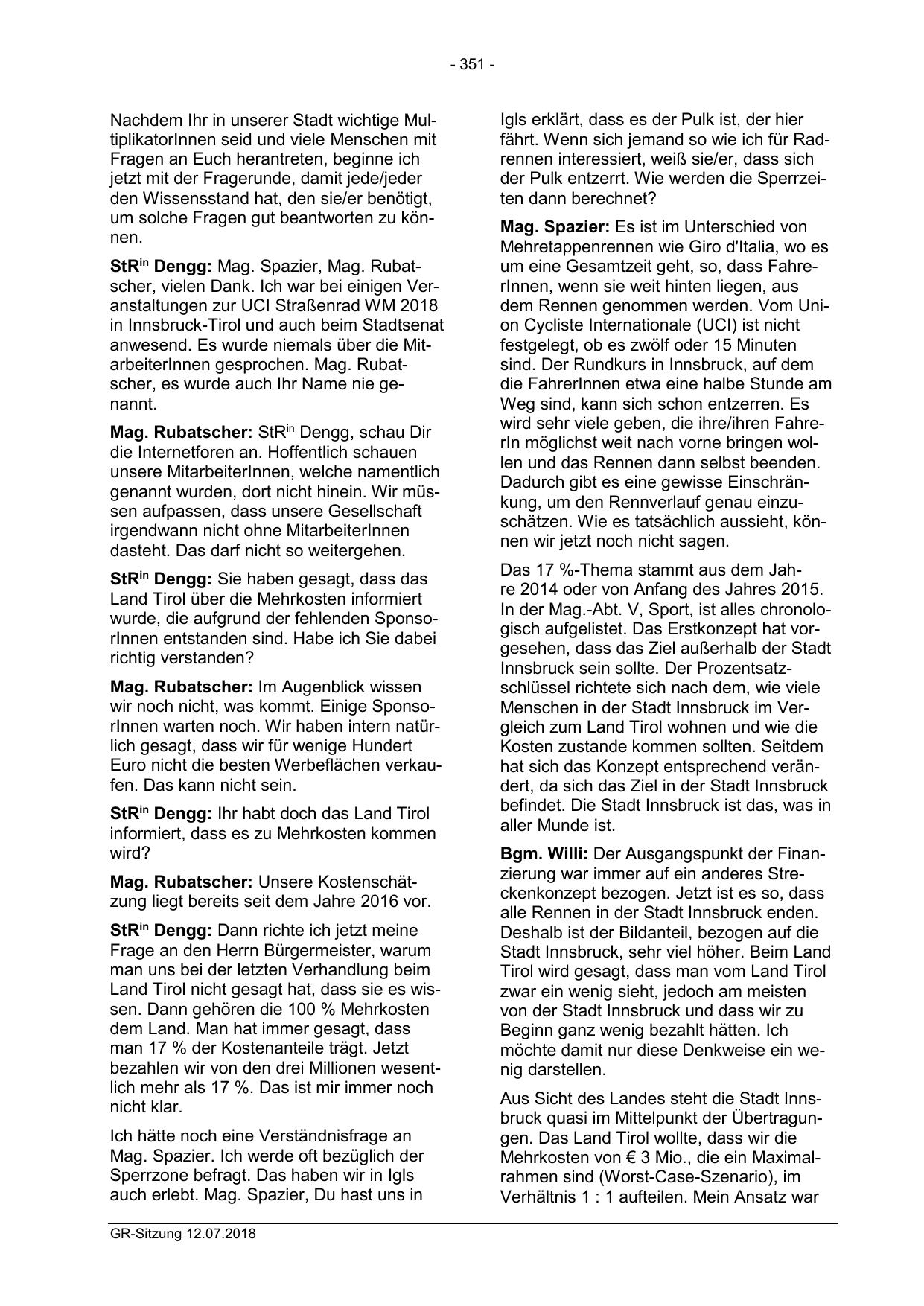 StRin Dengg: Mag. Spazier, Mag. Rubatscher, vielen Dank. Ich war bei einigen Veranstaltungen zur UCI Straßenrad WM 2018