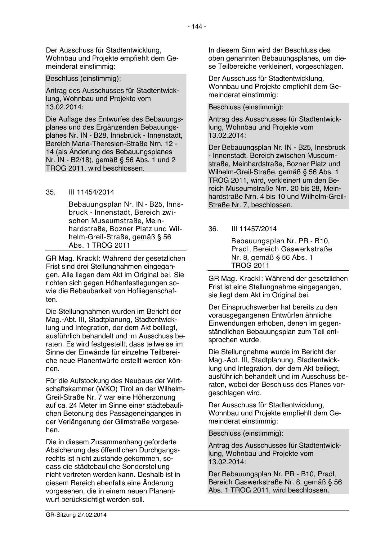 Die Auflage des Entwurfes des Bebauungsplanes und des Ergänzenden Bebauungsplanes Nr. IN - B28, Innsbruck - Innenstadt,