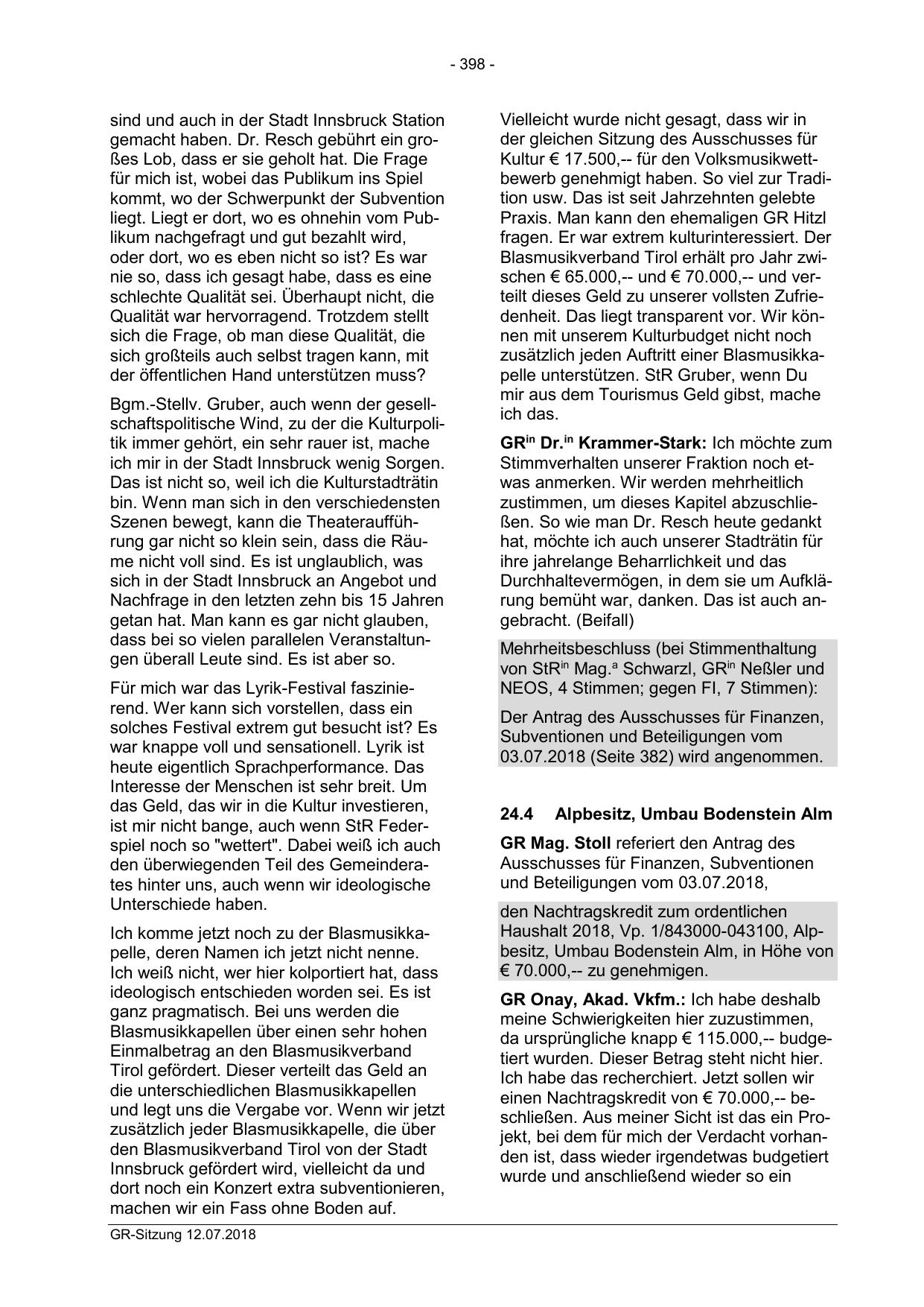 Blasmusikverband Tirol erhält pro Jahr zwischen € 65.000,-- und € 70.000,-- und verteilt dieses Geld zu unserer vollsten Zufriedenheit. Das liegt transparent vor. Wir können mit unserem Kulturbudget nicht noch