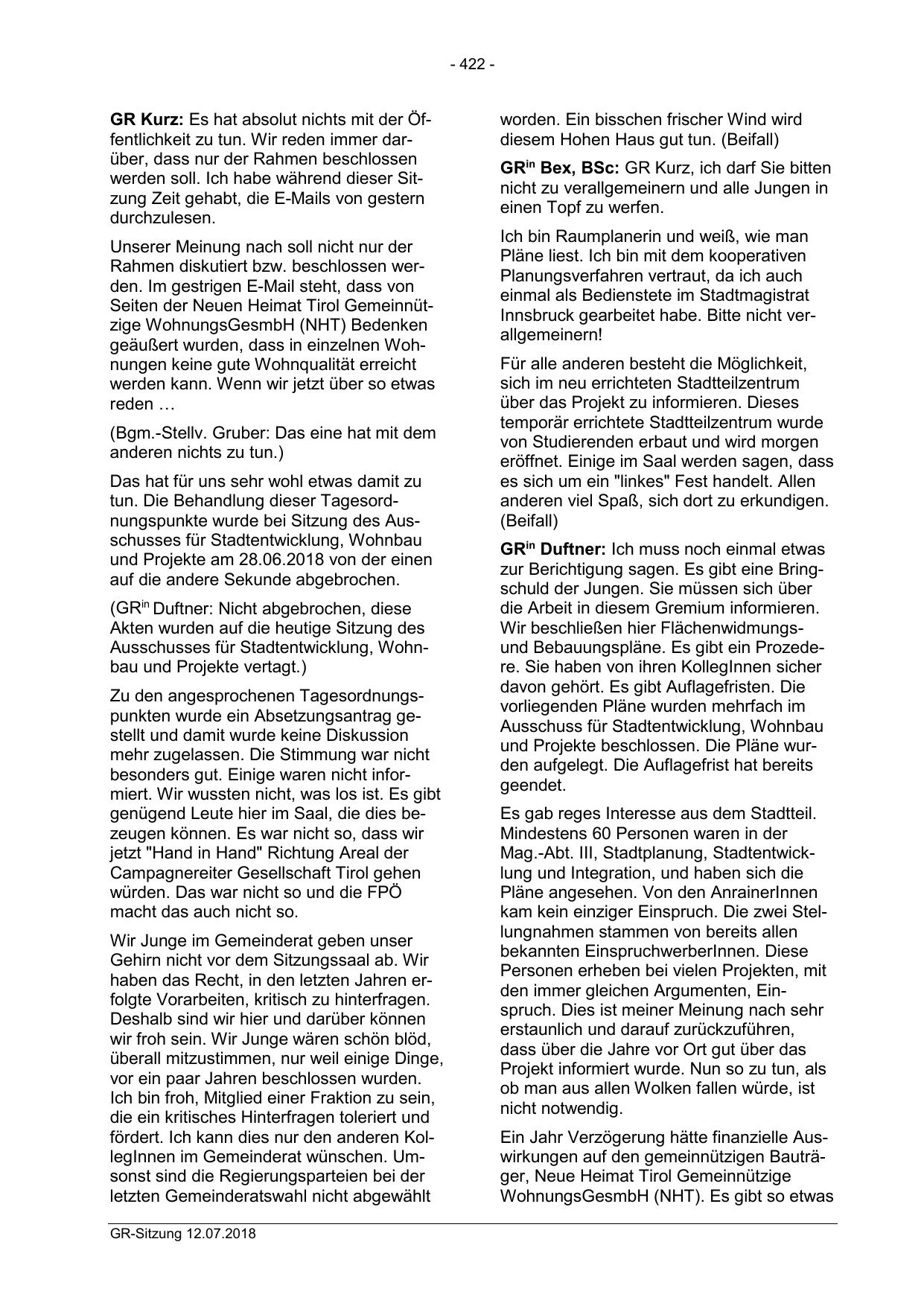 GRin Bex, BSc: GR Kurz, ich darf Sie bitten