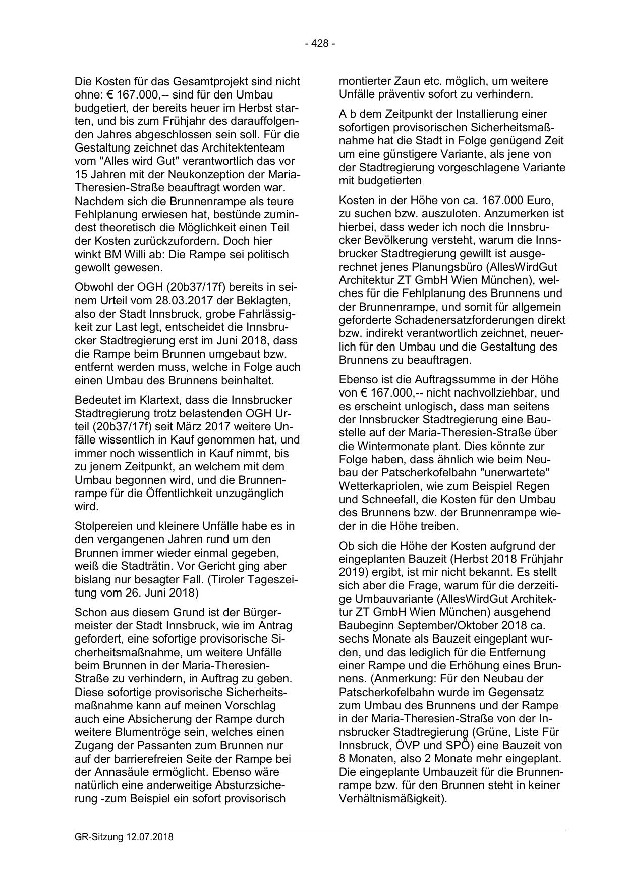 also der Stadt Innsbruck, grobe Fahrlässigkeit zur Last legt, entscheidet die Innsbrucker Stadtregierung erst im Juni 2018, dass
