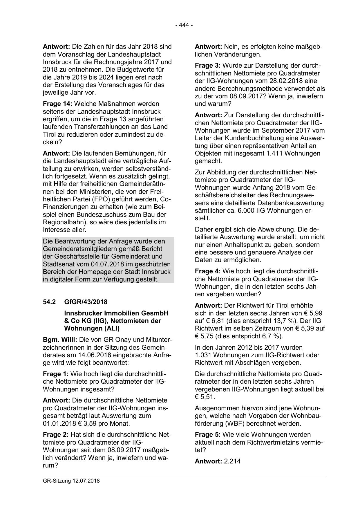 Bgm. Willi: Die von GR Onay und MitunterzeichnerInnen in der Sitzung des Gemeinderates am 14.06.2018 eingebrachte Anfrage wird wie folgt beantwortet: