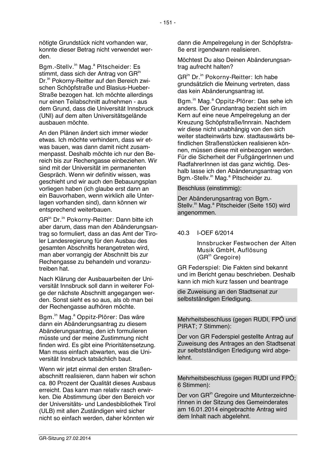 Der Abänderungsantrag von Bgm.Stellv.in Mag.a Pitscheider (Seite 150) wird