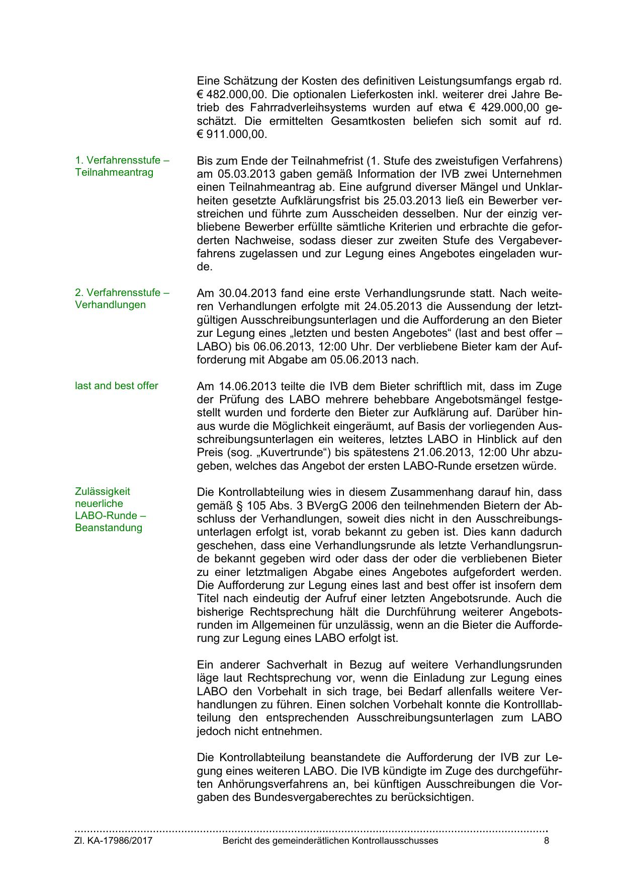 Die Kontrollabteilung beanstandete die Aufforderung der IVB zur Legung eines weiteren LABO. Die IVB kündigte im Zuge des durchgeführten Anhörungsverfahrens an, bei künftigen Ausschreibungen die Vorgaben des Bundesvergaberechtes zu berücksichtigen.