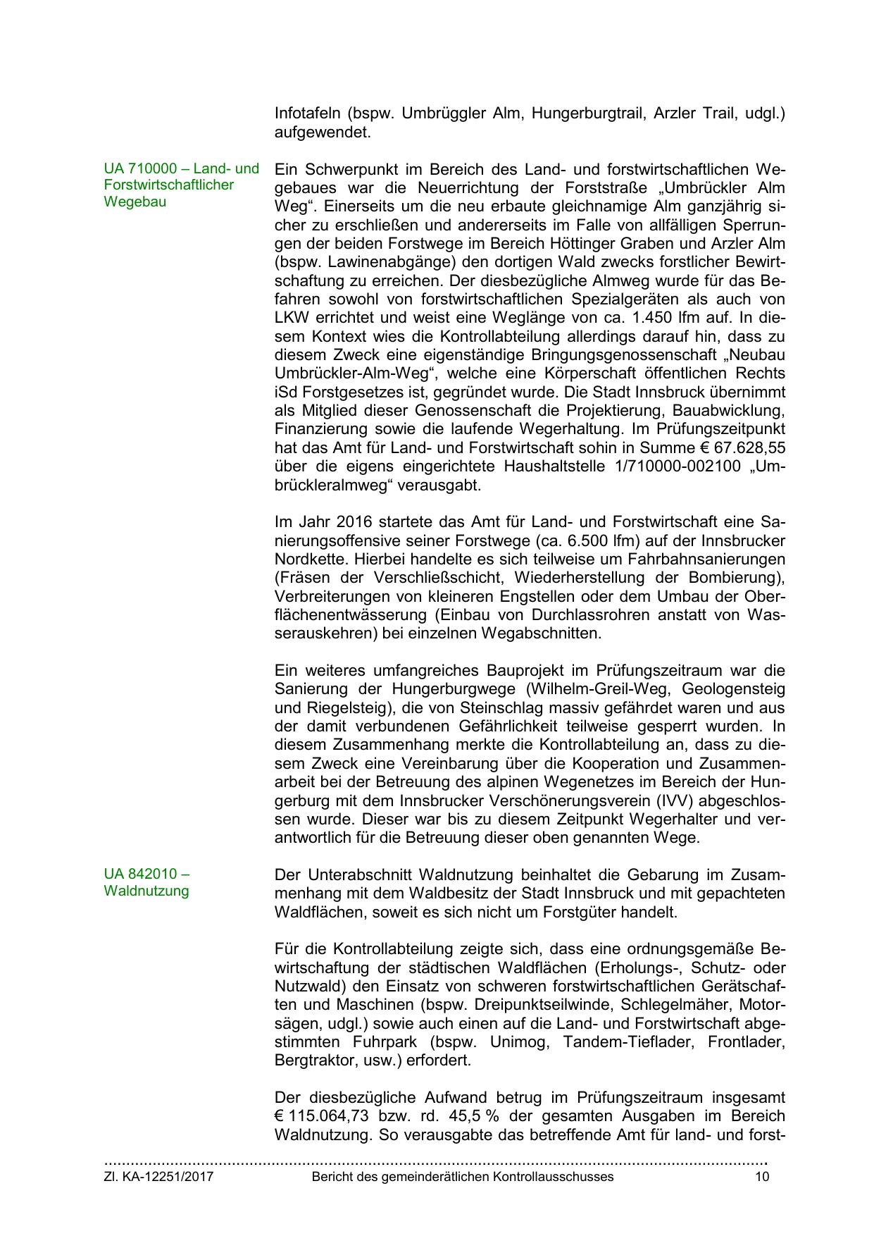 Der Unterabschnitt Waldnutzung beinhaltet die Gebarung im Zusammenhang mit dem Waldbesitz der Stadt Innsbruck und mit gepachteten