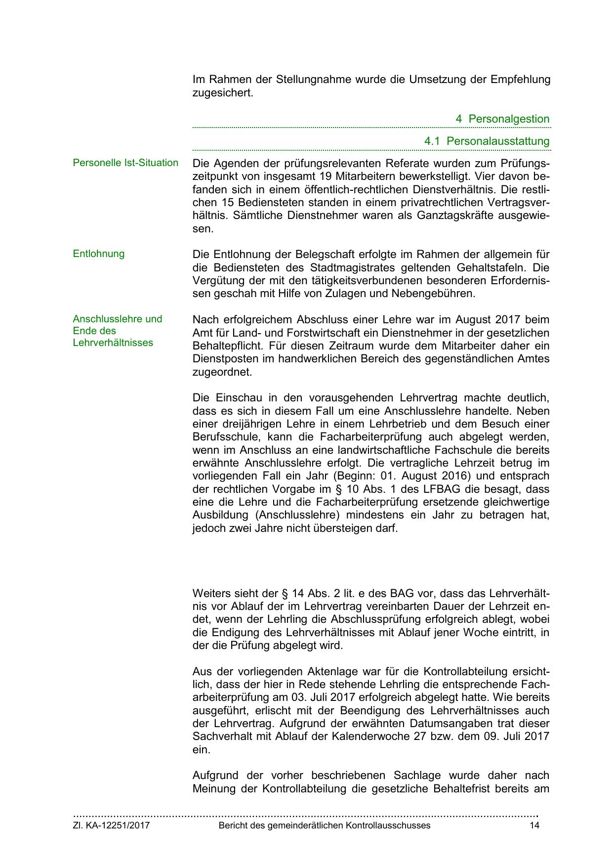 Die Agenden der prüfungsrelevanten Referate wurden zum Prüfungszeitpunkt von insgesamt 19 Mitarbeitern bewerkstelligt. Vier davon befanden sich in einem öffentlich-rechtlichen Dienstverhältnis. Die restlichen 15 Bediensteten standen in einem privatrechtlichen Vertragsverhältnis. Sämtliche Dienstnehmer waren als Ganztagskräfte ausgewiesen.