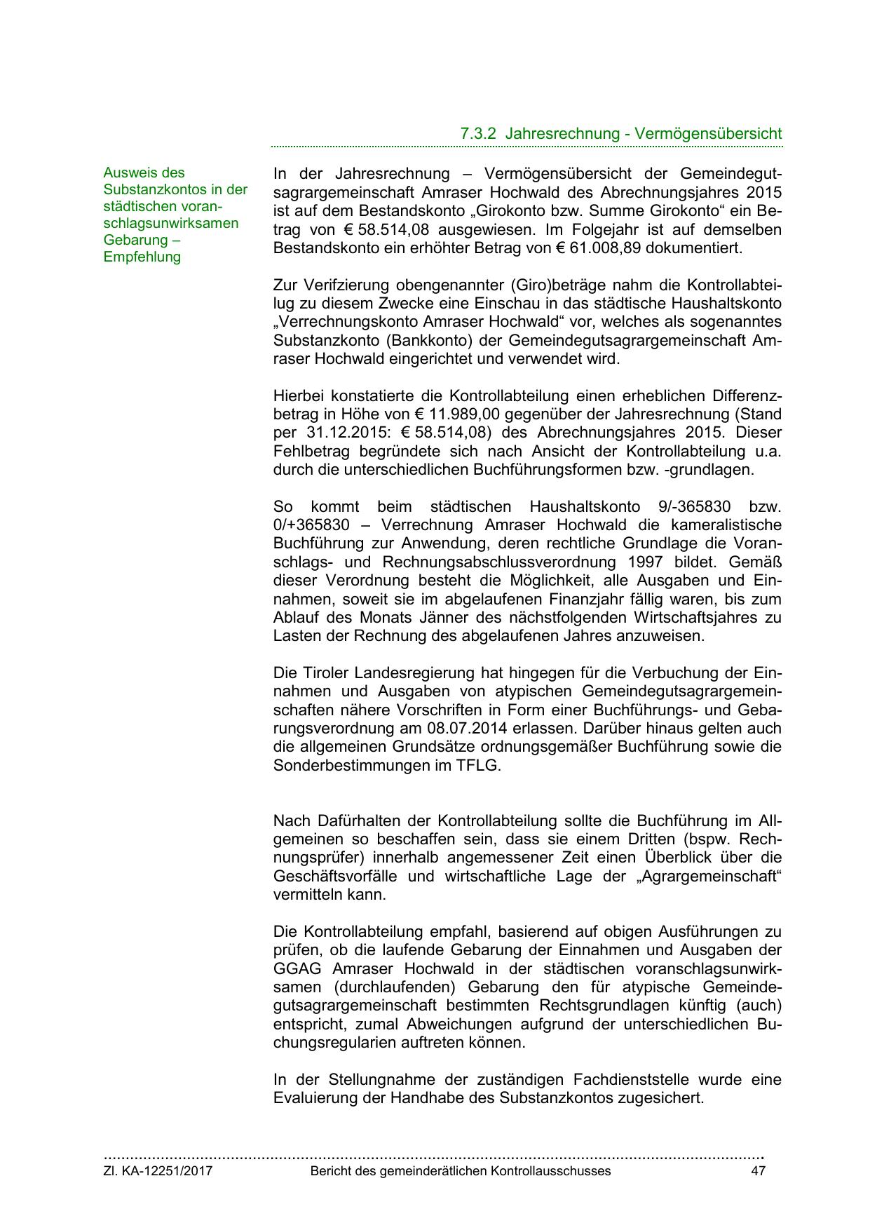 GGAG Amraser Hochwald in der städtischen voranschlagsunwirksamen (durchlaufenden) Gebarung den für atypische Gemeindegutsagrargemeinschaft bestimmten Rechtsgrundlagen künftig (auch)