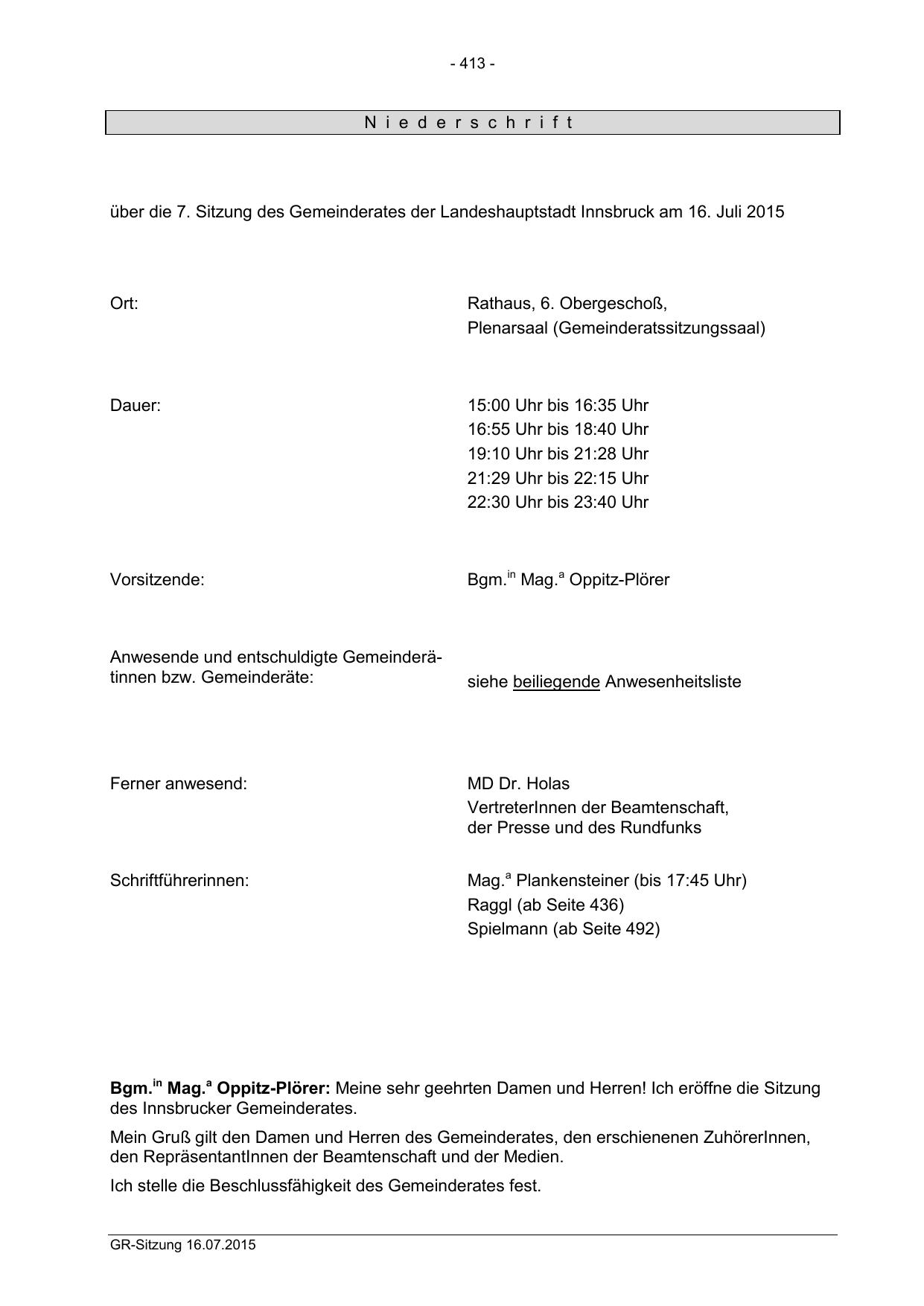 über die 7. Sitzung des Gemeinderates der Landeshauptstadt Innsbruck am 16. Juli 2015