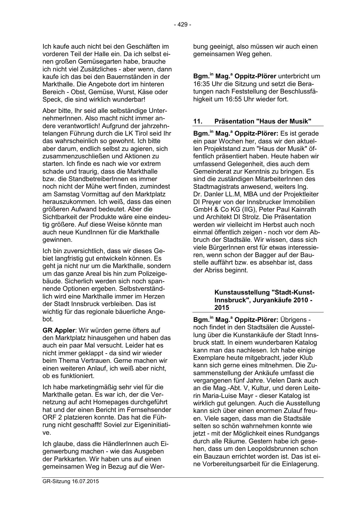 Bgm.in Mag.a Oppitz-Plörer: Übrigens noch findet in den Stadtsälen die Ausstellung über die Kunstankäufe der Stadt Innsbruck statt. In einem wunderbaren Katalog