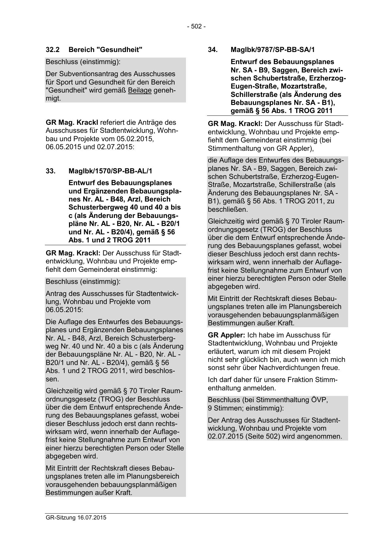GR Mag. Krackl: Der Ausschuss für Stadtentwicklung, Wohnbau und Projekte empfiehlt dem Gemeinderat einstimmig (bei