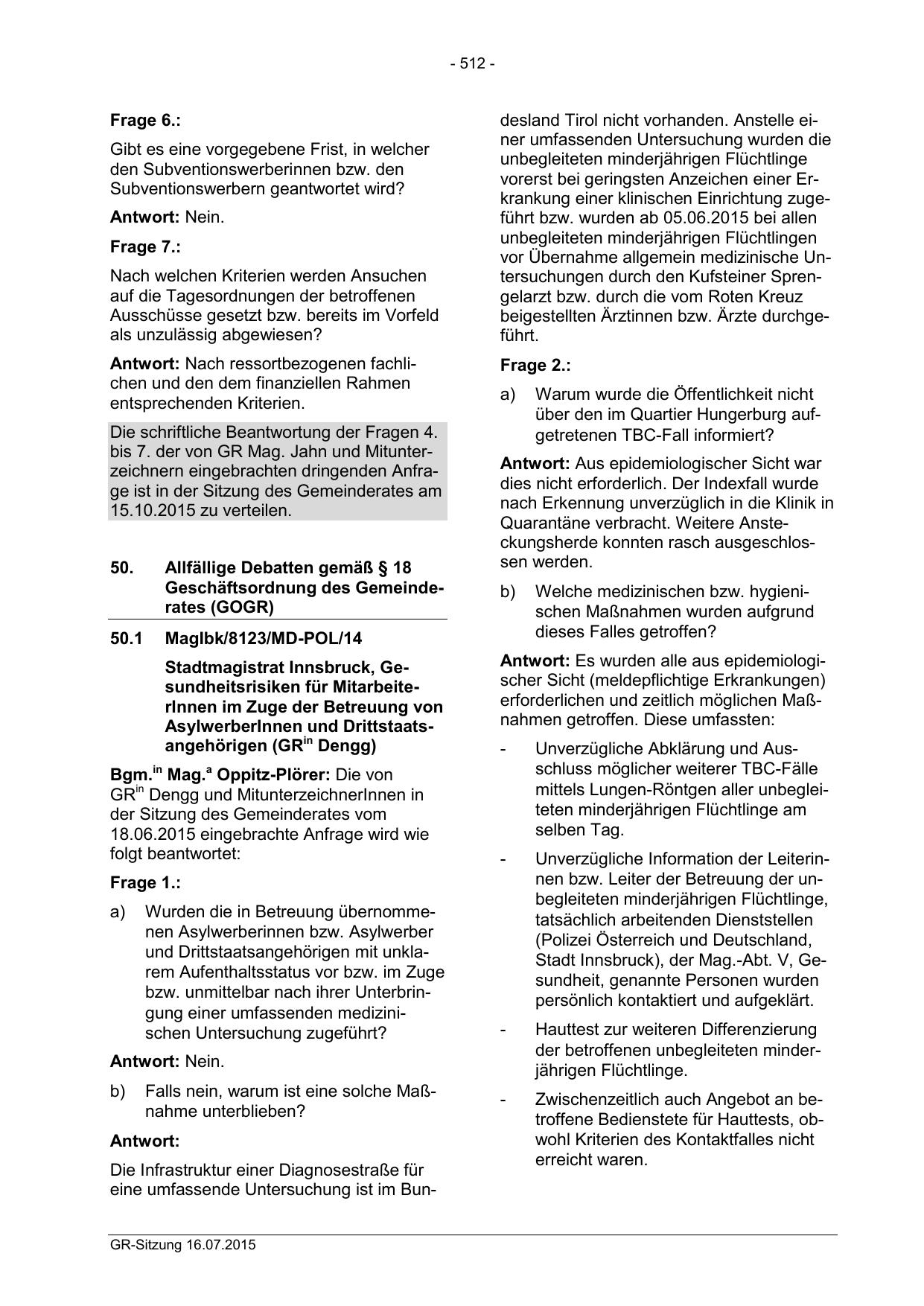 bis 7. der von GR Mag. Jahn und Mitunterzeichnern eingebrachten dringenden Anfrage ist in der Sitzung des Gemeinderates am