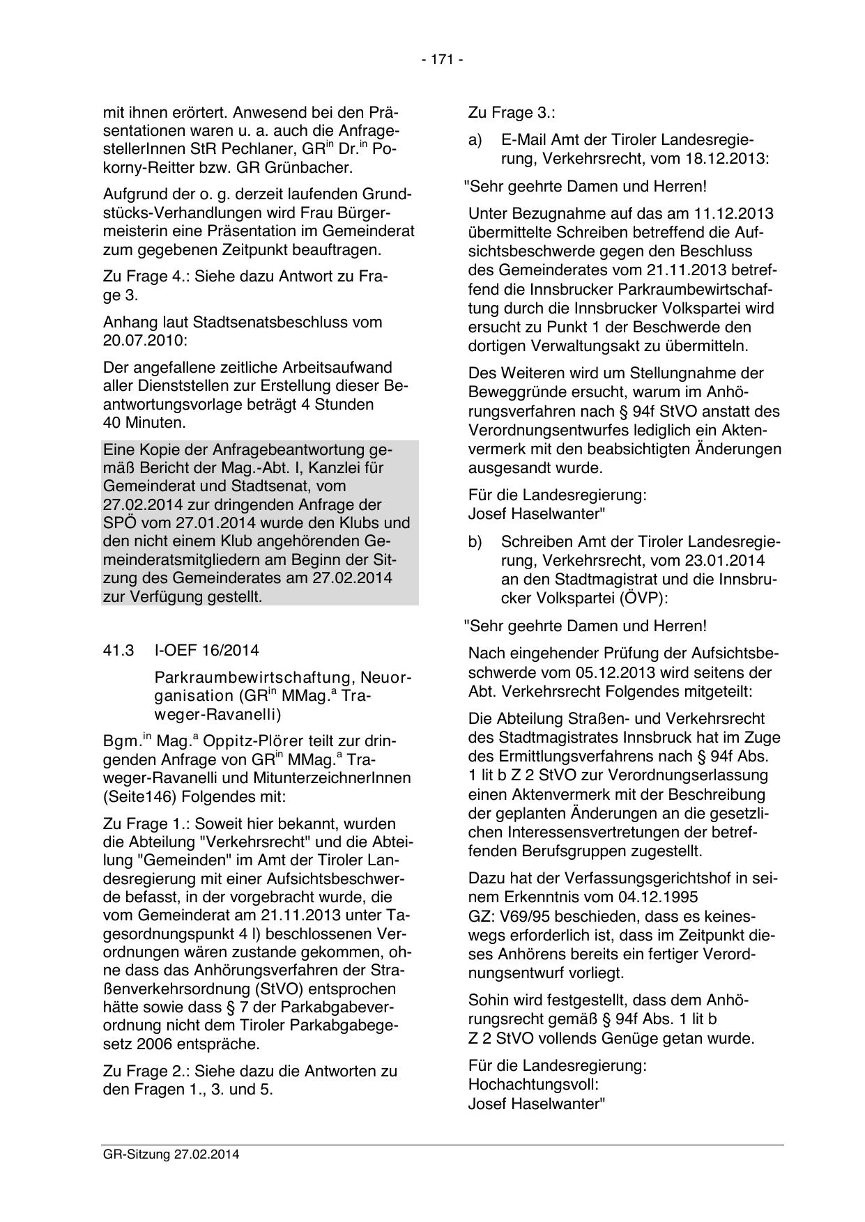 des Gemeinderates vom 21.11.2013 betreffend die Innsbrucker Parkraumbewirtschaftung durch die Innsbrucker Volkspartei wird