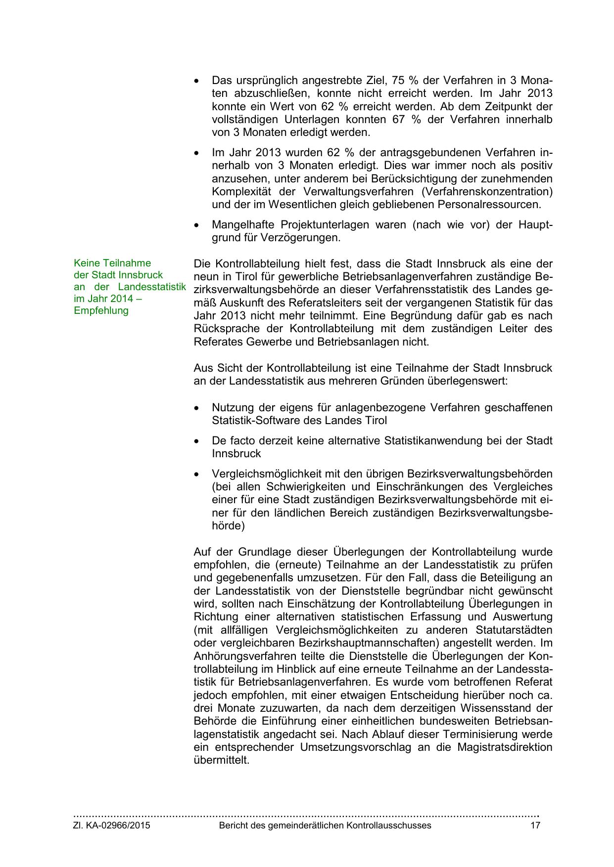 Anhörungsverfahren teilte die Dienststelle die Überlegungen der Kontrollabteilung im Hinblick auf eine erneute Teilnahme an der Landesstatistik für Betriebsanlagenverfahren. Es wurde vom betroffenen Referat