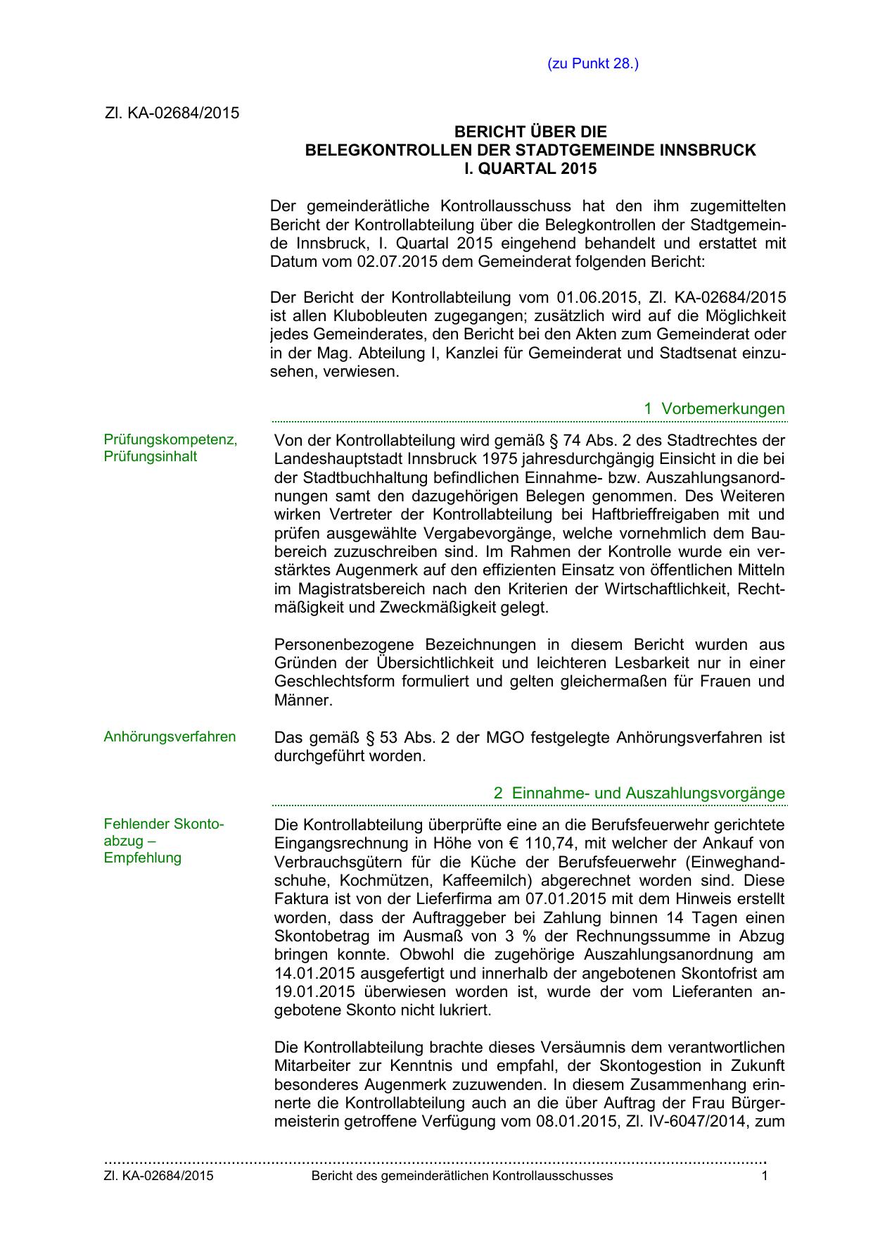 Bericht der Kontrollabteilung über die Belegkontrollen der Stadtgemeinde Innsbruck, I. Quartal 2015 eingehend behandelt und erstattet mit