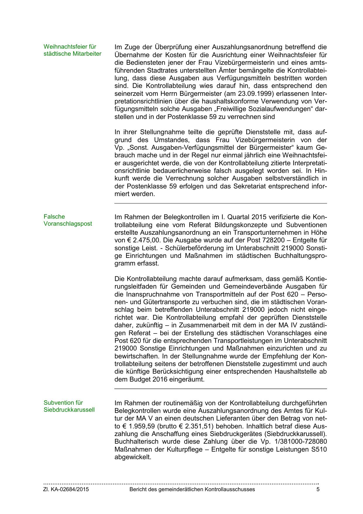 die Bediensteten jener der Frau Vizebürgermeisterin und eines amtsführenden Stadtrates unterstellten Ämter bemängelte die Kontrollabteilung, dass diese Ausgaben aus Verfügungsmitteln bestritten worden