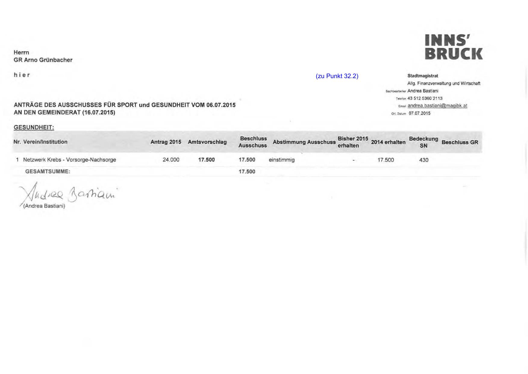 ANTRÄGE DES AU SSCHUSSES FÜR SPORT und GESUNDHEIT VOM 06.07.20 15