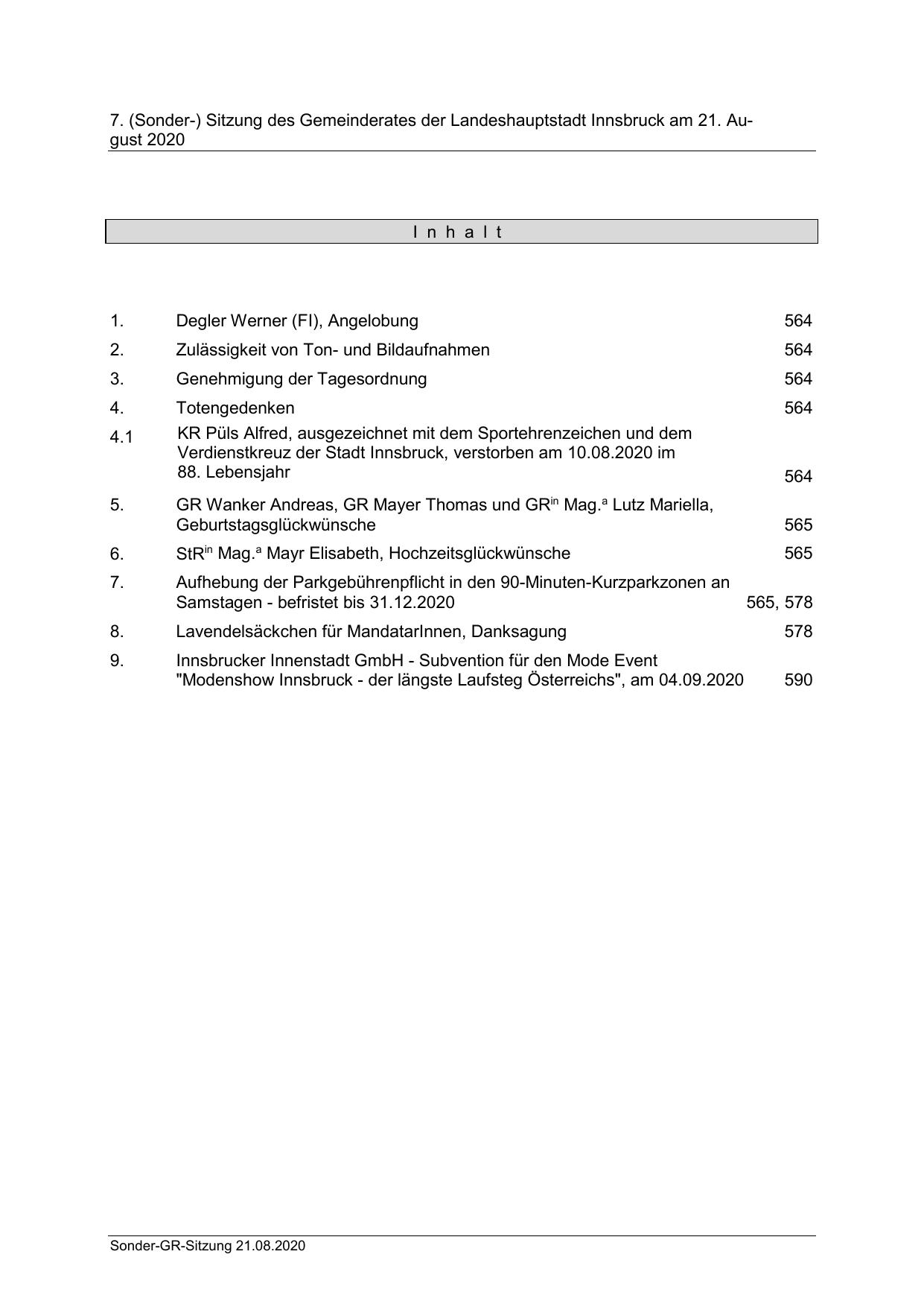 7. (Sonder-) Sitzung des Gemeinderates der Landeshauptstadt Innsbruck am 21. August 2020