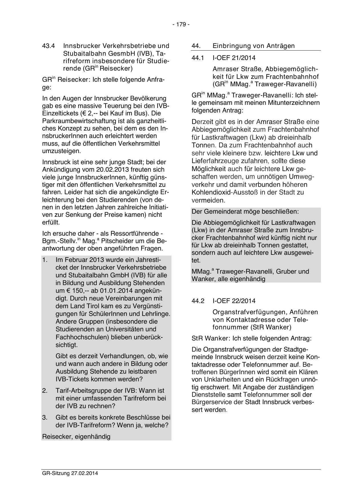 Ich ersuche daher - als Ressortführende Bgm.-Stellv.in Mag.a Pitscheider um die Beantwortung der oben angeführten Fragen.