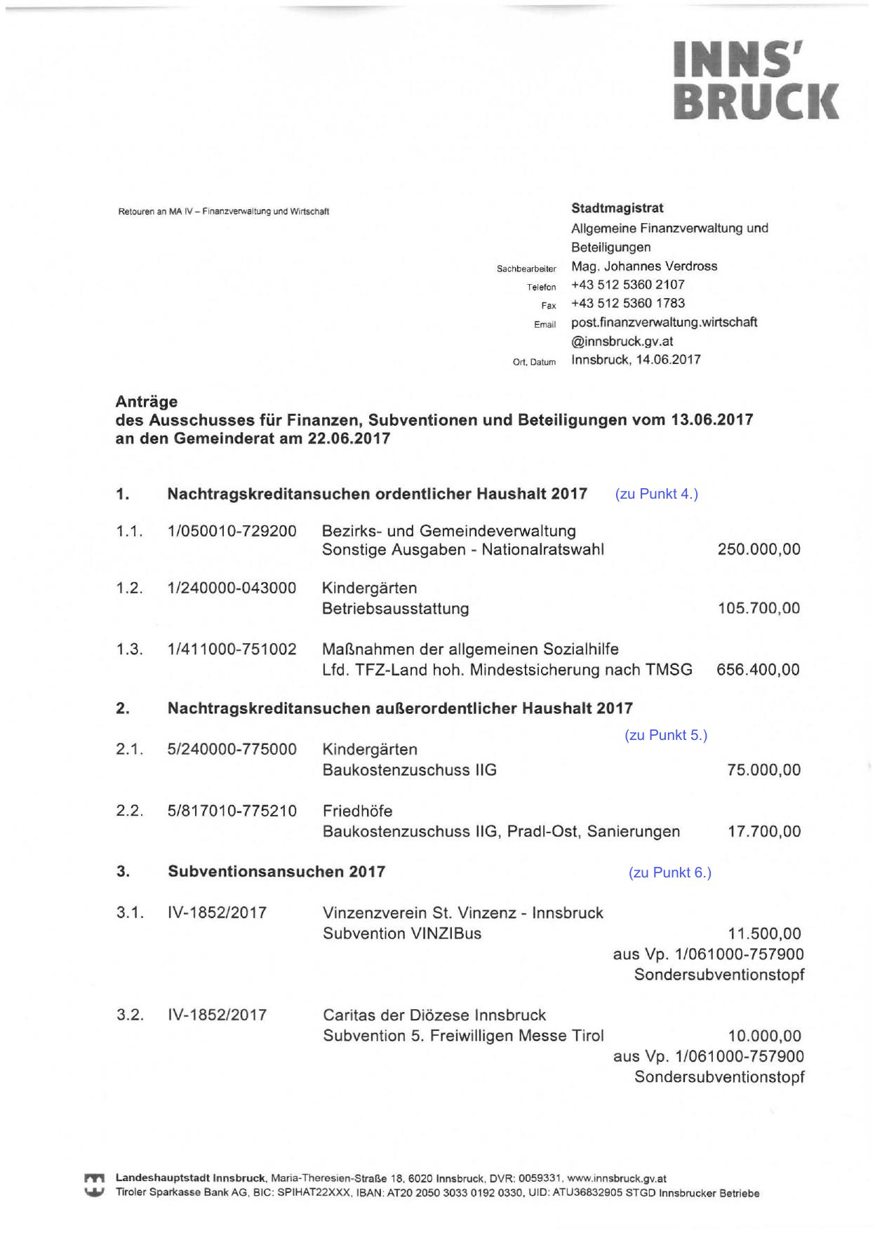 Nachtragskreditansuchen außerordentlicher Haushalt 2017