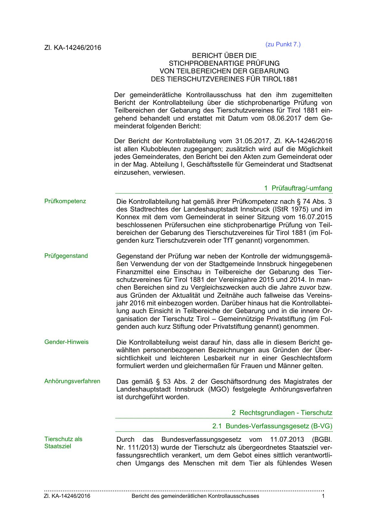 Teilbereichen der Gebarung des Tierschutzvereines für Tirol 1881 eingehend behandelt und erstattet mit Datum vom 08.06.2017 dem Gemeinderat folgenden Bericht: