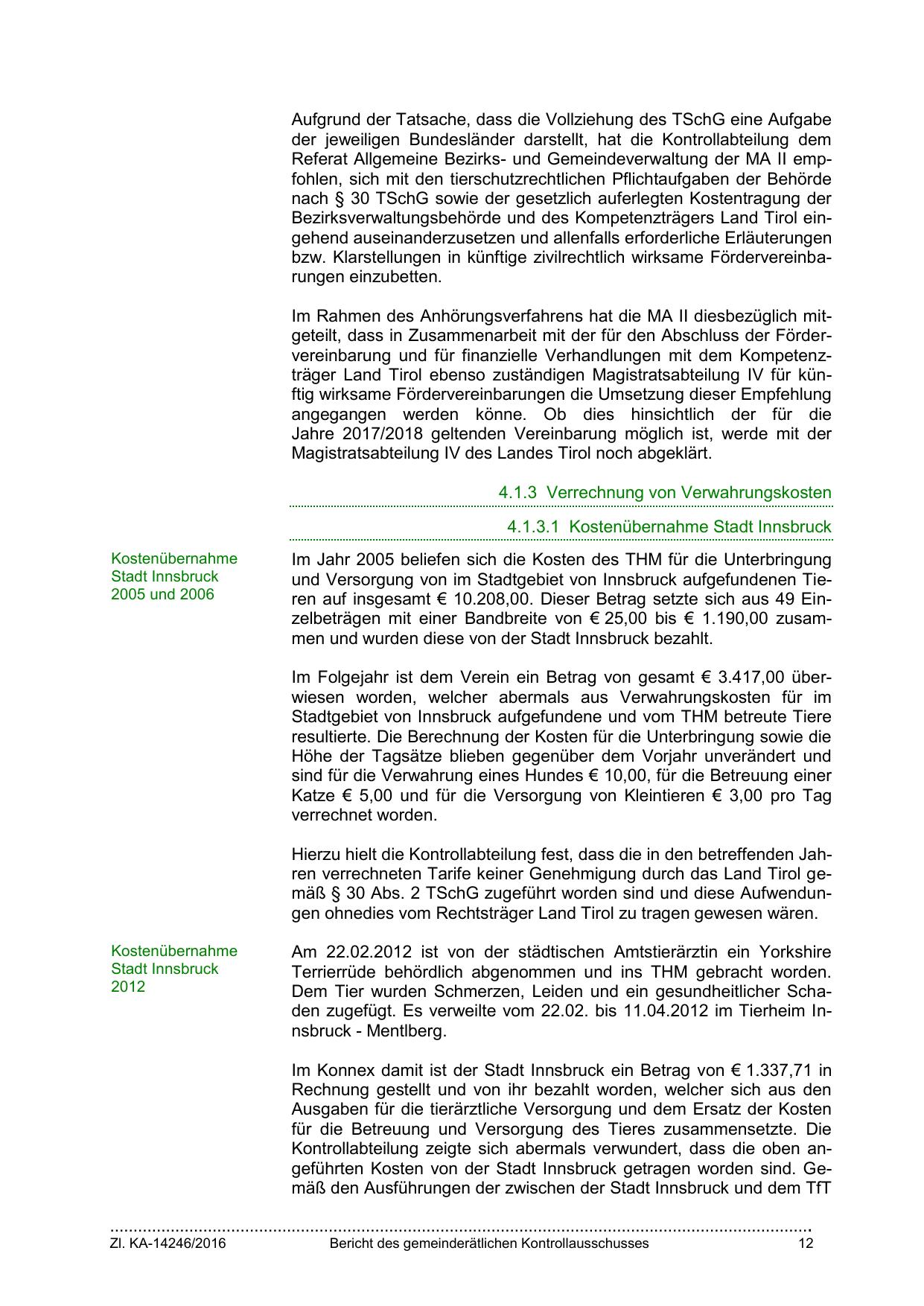 Hierzu hielt die Kontrollabteilung fest, dass die in den betreffenden Jahren verrechneten Tarife keiner Genehmigung durch das Land Tirol gemäß § 30 Abs. 2 TSchG zugeführt worden sind und diese Aufwendungen ohnedies vom Rechtsträger Land Tirol zu tragen gewesen wären.