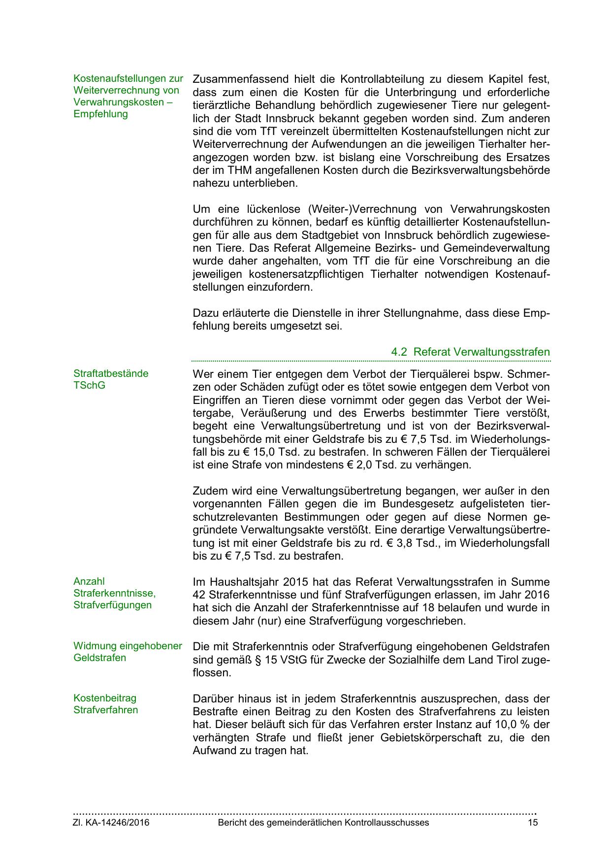 durchführen zu können, bedarf es künftig detaillierter Kostenaufstellungen für alle aus dem Stadtgebiet von Innsbruck behördlich zugewiesenen Tiere. Das Referat Allgemeine Bezirks- und Gemeindeverwaltung