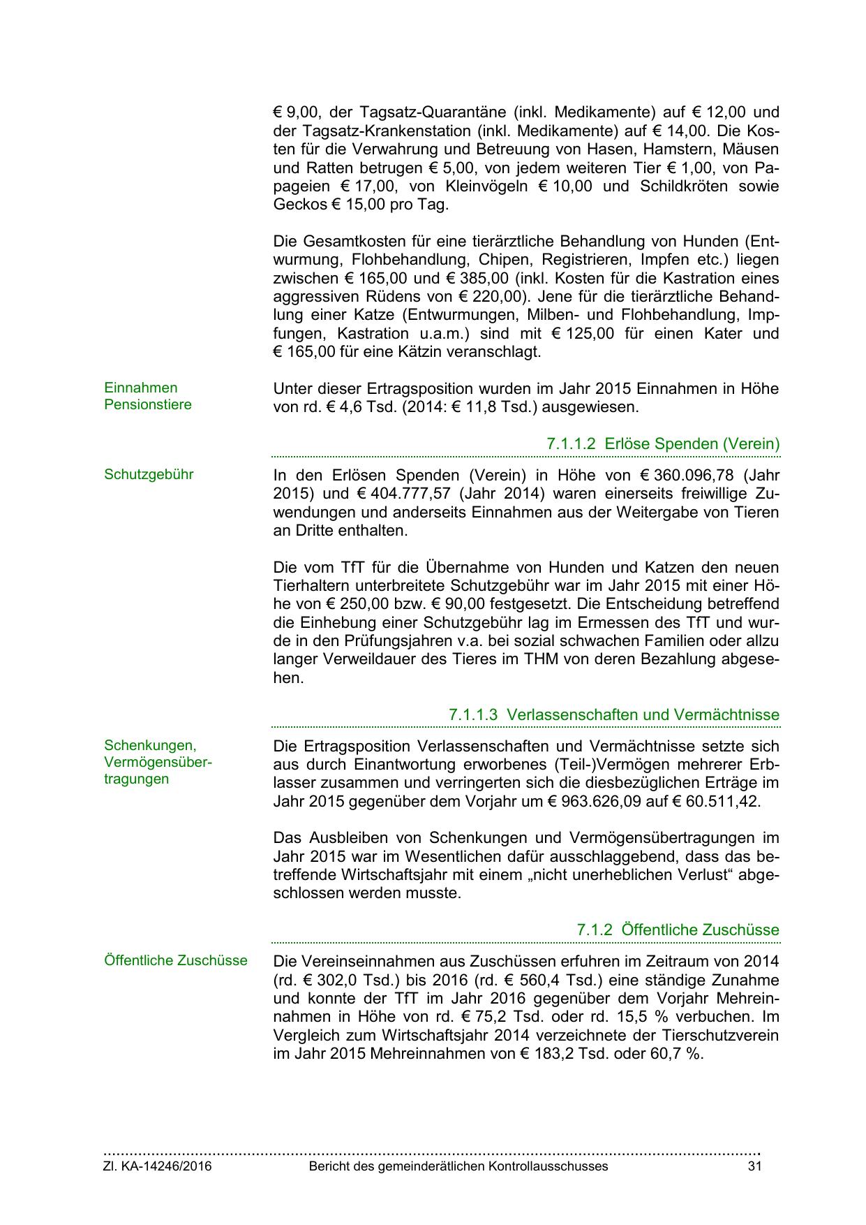 2015) und € 404.777,57 (Jahr 2014) waren einerseits freiwillige Zuwendungen und anderseits Einnahmen aus der Weitergabe von Tieren
