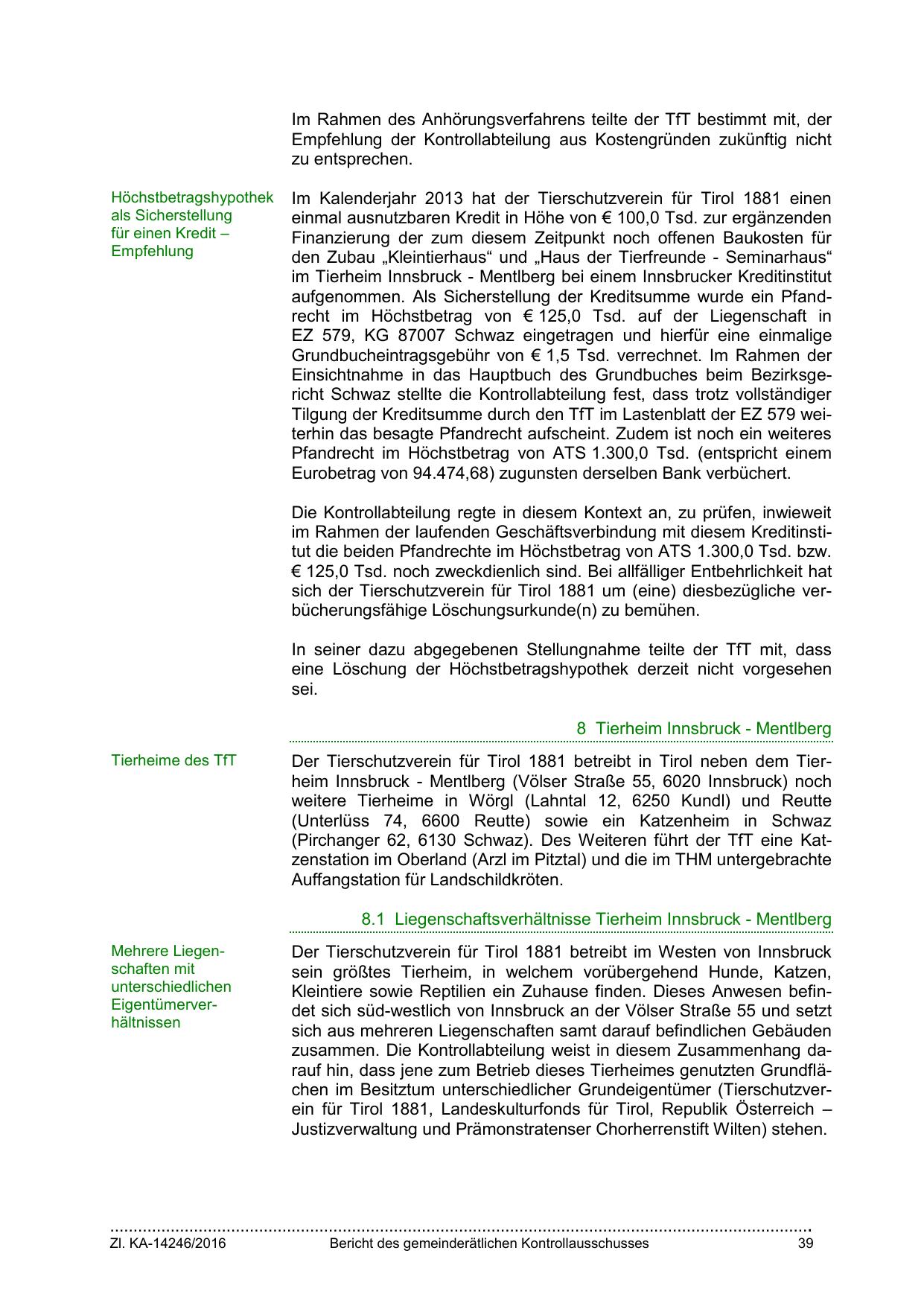 zusammen. Die Kontrollabteilung weist in diesem Zusammenhang darauf hin, dass jene zum Betrieb dieses Tierheimes genutzten Grundflächen im Besitztum unterschiedlicher Grundeigentümer (Tierschutzverein für Tirol 1881, Landeskulturfonds für Tirol, Republik Österreich –