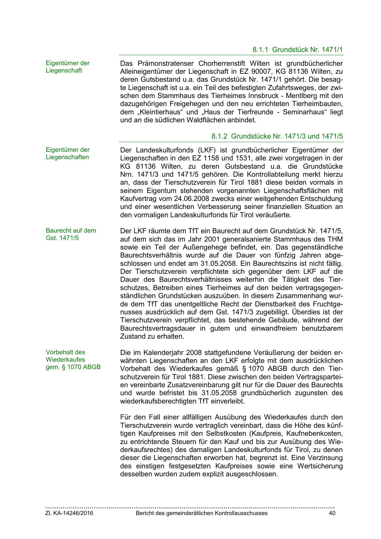 Vorbehalt des Wiederkaufes gemäß § 1070 ABGB durch den Tierschutzverein für Tirol 1881. Diese zwischen den beiden Vertragsparteien vereinbarte Zusatzvereinbarung gilt nur für die Dauer des Baurechts